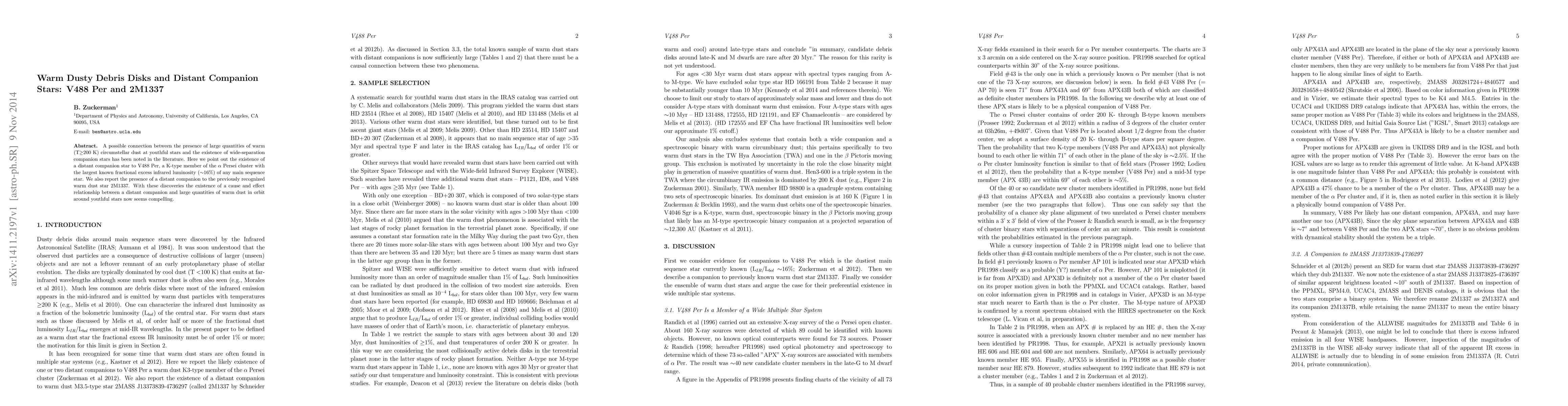 A possible connection between the presence of large quantities of warm (T$\geq$200 K) circumstellar dust at youthful stars and the existence of wide-separation companion stars has been noted in the literature. Here we point out the existence of a distant companion star to V488 Per, a K-type member of the $\alpha$ Persei cluster with the largest known fractional excess infrared luminosity ($\sim$16\%) of any main sequence star. We also report the presence of a distant companion to the previously recognized warm dust star 2M1337. With these discoveries the existence of a cause and effect relationship between a distant companion and large quantities of warm dust in orbit around youthful stars now seems compelling.