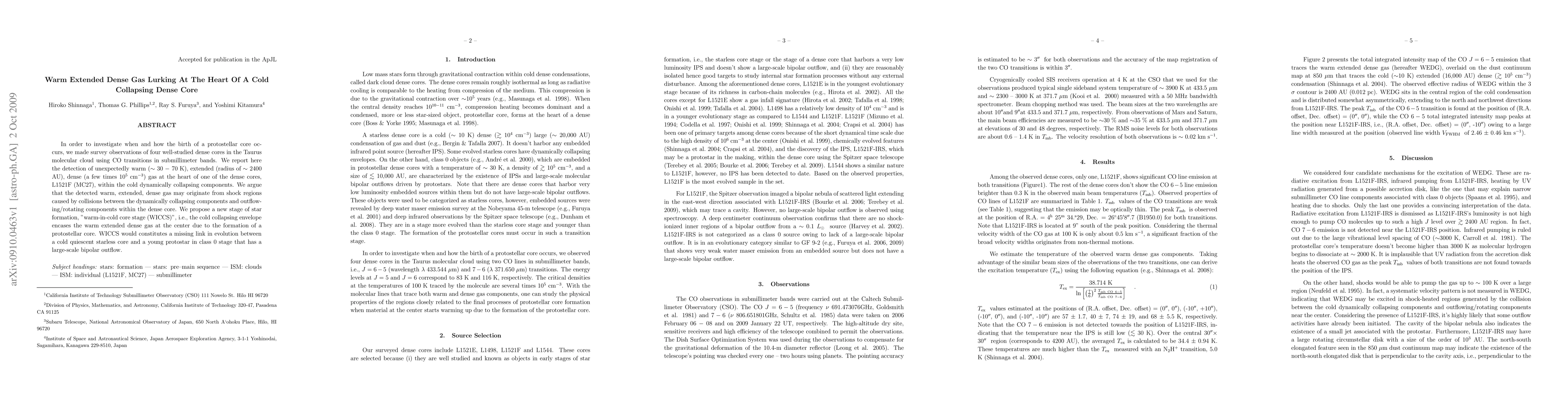 In order to investigate when and how the birth of a protostellar core occurs, we made survey observations of four well-studied dense cores in the Taurus molecular cloud using CO transitions in submillimeter bands. We report here the detection of unexpectedly warm (~ 30 - 70 K), extended (radius of ~ 2400 AU), dense (a few times 10^{5} cm^{-3}) gas at the heart of one of the dense cores, L1521F (MC27), within the cold dynamically collapsing components. We argue that the detected warm, extended, dense gas may originate from shock regions caused by collisions between the dynamically collapsing components and outflowing/rotating components within the dense core. We propose a new stage of star formation, "warm-in-cold core stage (WICCS)", i.e., the cold collapsing envelope encases the warm extended dense gas at the center due to the formation of a protostellar core. WICCS would constitutes a missing link in evolution between a cold quiescent starless core and a young protostar in class 0 stage that has a large-scale bipolar outflow.