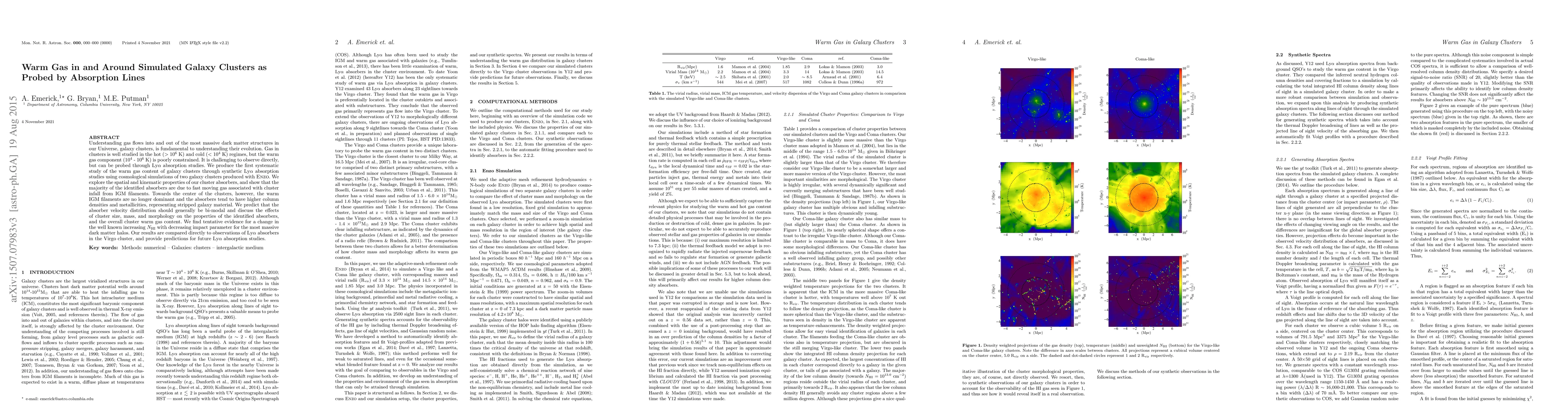 This research investigates the warm gas in and around galaxy clusters using synthetic Ly$\alpha$ absorption studies from cosmological simulations. It finds that fast-moving gas from infalling IGM filaments dominates the warm gas, while central regions show higher column densities and metallicities from stripped galaxy material.