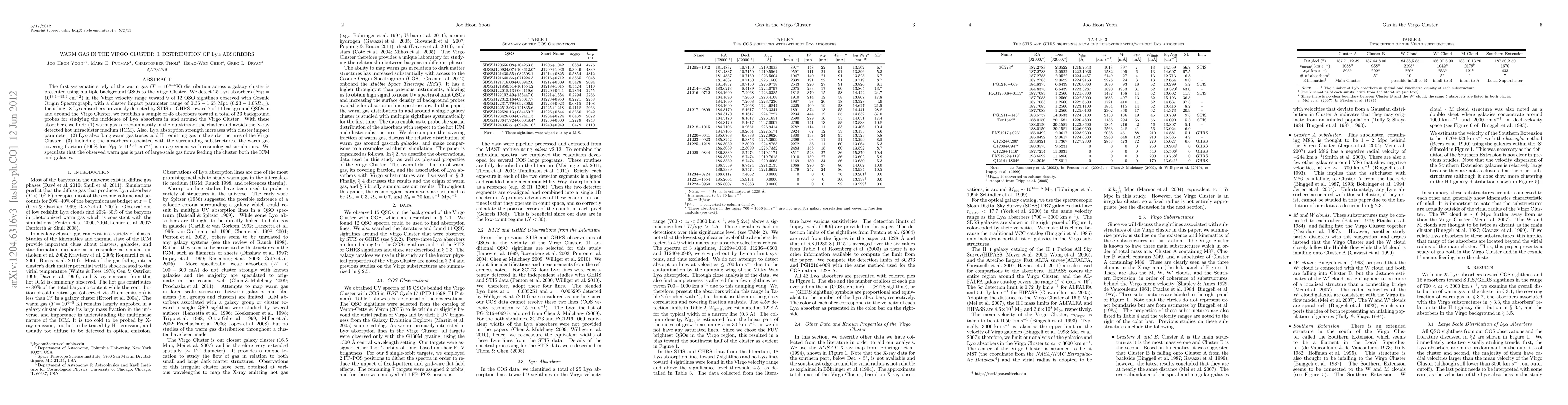 The first systematic study of the warm gas (T=10^4-5 K) distribution across a galaxy cluster is presented using multiple background QSOs to the Virgo Cluster. We detect 25 Lya absorbers (N_HI = 10^13.1-15.4 cm^-2) in the Virgo velocity range toward 9 of 12 QSO sightlines observed with Cosmic Origin Spectrograph, with a cluster impact parameter range of 0.36-1.65 Mpc (0.23-1.05R_vir). Including 18 Lya absorbers previously detected by STIS or GHRS toward 7 of 11 background QSOs in and around the Virgo Cluster, we establish a sample of 43 absorbers towards a total of 23 background probes for studying the incidence of Lya absorbers in and around the Virgo Cluster. With these absorbers, we find: (1) warm gas is predominantly in the outskirts of the cluster and avoids the X-ray detected hot ICM. Also, Lya absorption strength increases with cluster impact parameter. (2) Lya absorbing warm gas traces cold HI emitting gas in the substructures of the Virgo Cluster. (3) Including the absorbers associated with the surrounding substructures, the warm gas covering fraction (100% for N_HI > 10^13.1 cm^-2) is in agreement with cosmological simulations. We speculate that the observed warm gas is part of large-scale gas flows feeding the cluster both the ICM and galaxies.