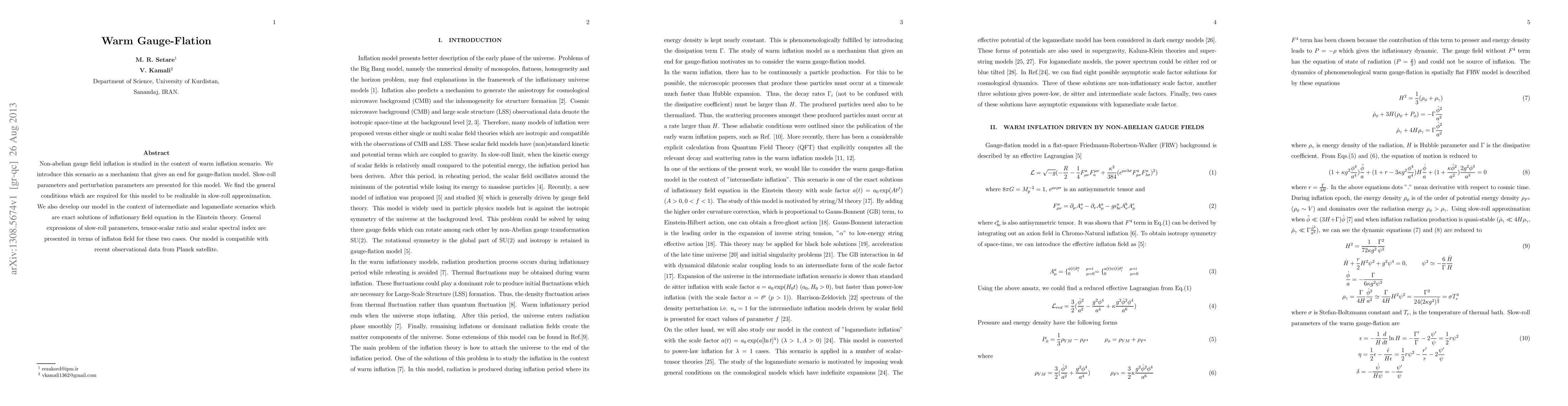 This paper proposes a new inflationary scenario called warm gauge-flation, which combines non-abelian gauge field inflation with slow-roll approximation, and is compatible with recent observational data from the Planck satellite.
