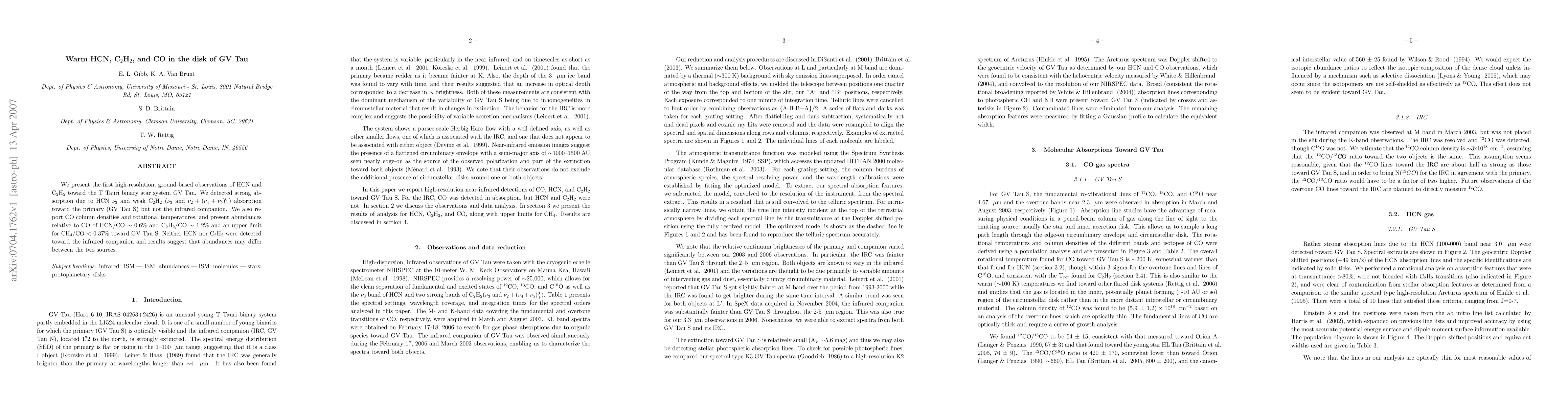 We present the first high-resolution, ground-based observations of HCN and C2H2 toward the T Tauri binary star system GV Tau. We detected strong absorption due to HCN nu_3 and weak C2H2 (nu_3 and nu_2 + (nu_4 + nu_5)^0_+) absorption toward the primary (GV Tau S) but not the infrared companion. We also report CO column densities and rotational temperatures, and present abundances relative to CO of HCN/CO ~0.6% and C2H2/CO ~1.2% and an upper limit for CH4/CO < 0.37% toward GV Tau S. Neither HCN nor C2H2 were detected toward the infrared companion and results suggest that abundances may differ between the two sources.