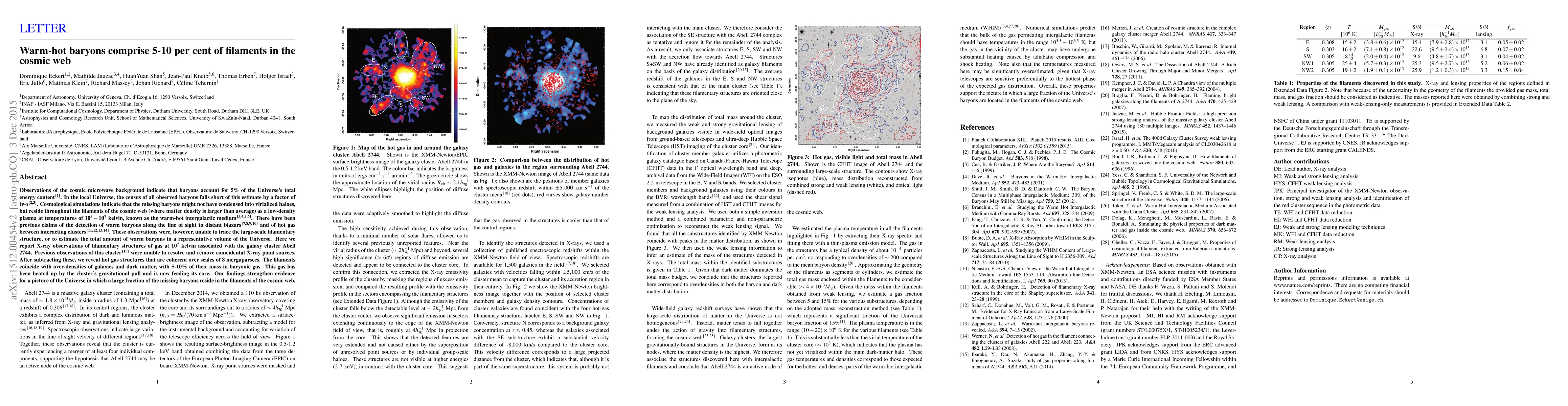 This paper reports X-ray observations revealing that 5-10% of filaments in the cosmic web consist of warm-hot baryonic gas at temperatures of $10^7$ kelvin. The study identifies these structures in the galaxy cluster Abell 2744, providing evidence that a significant portion of the missing baryons resides in the cosmic web's filaments.
