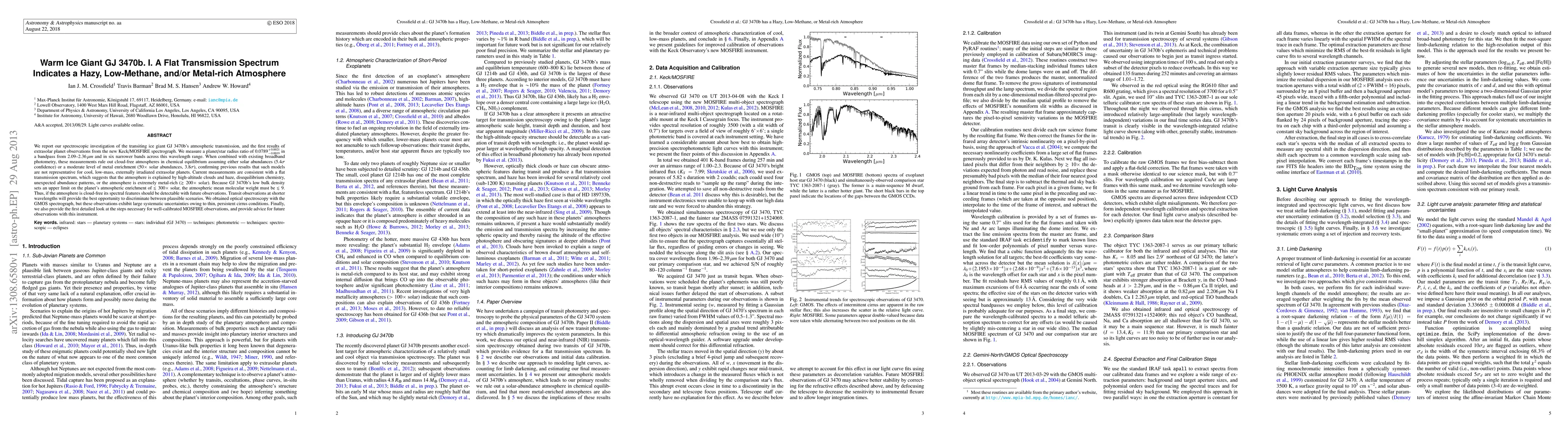 The study of the warm ice giant GJ 3470b reveals a flat transmission spectrum indicating a hazy, low-methane, and/or metal-rich atmosphere, ruling out cloud-free models. Future observations at shorter wavelengths are needed to better understand the atmospheric composition and disequilibrium chemistry.