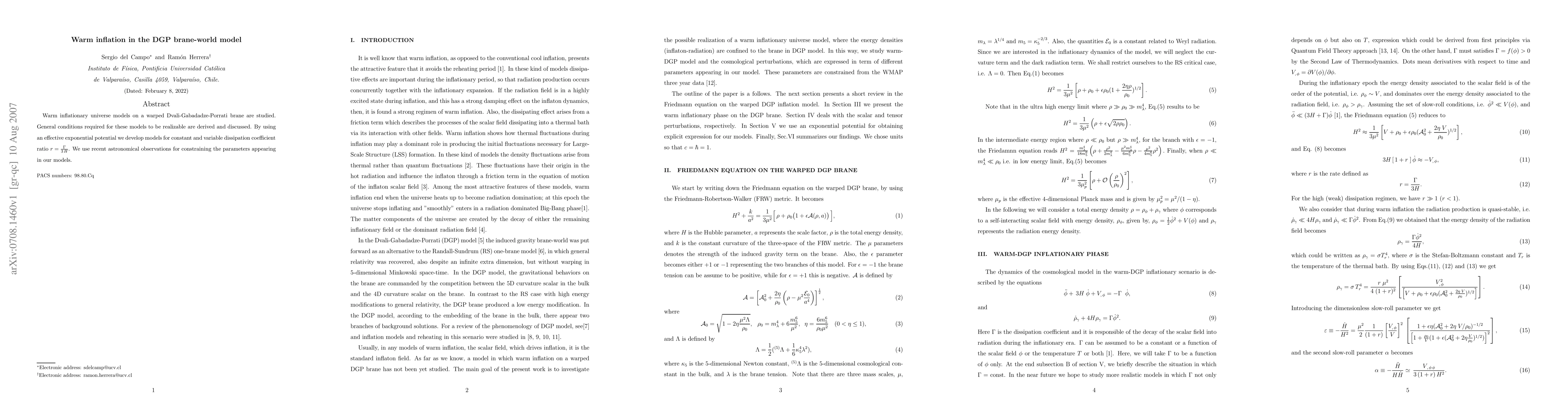 Warm inflationary universe models on a warped Dvali-Gabadadze-Porrati brane are studied. General conditions required for these models to be realizable are derived and discussed. By using an effective exponential potential we develop models for constant and variable dissipation coefficient ratio $r=\frac{\Gamma}{3 H}$. We use recent astronomical observations for constraining the parameters appearing in our models.