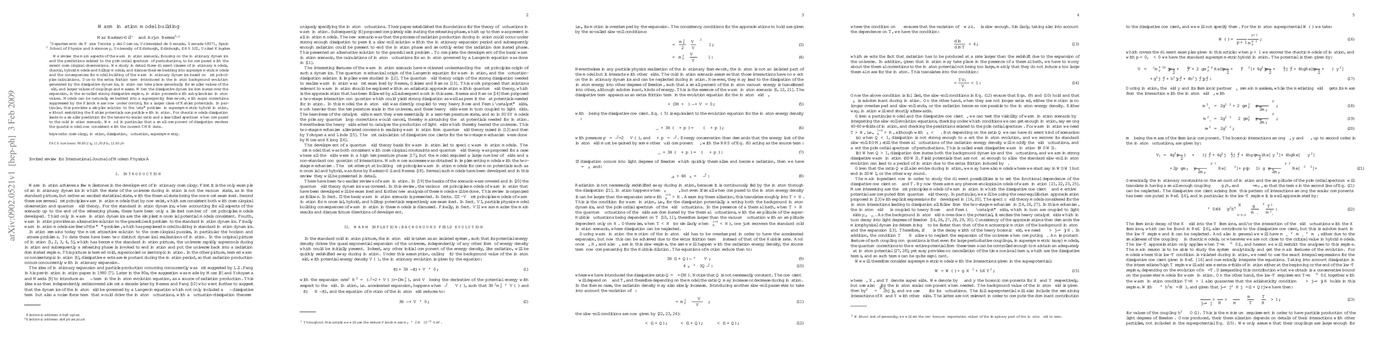 We review the main aspects of the warm inflation scenario, focusing on the inflationary dynamics and the predictions related to the primordial spectrum of perturbations, to be compared with the recent cosmological observations. We study in detail three different classes of inflationary models, chaotic, hybrid models and hilltop models, and discuss their embedding into supersymmetric models and the consequences for model building of the warm inflationary dynamics based on first principles calculations. Due to the extra friction term introduced in the inflaton background evolution generated by the dissipative dynamics, inflation can take place generically for smaller values of the field, and larger values of couplings and masses. When the dissipative dynamics dominates over the expansion, in the so-called strong dissipative regime, inflation proceeds with sub-planckian inflaton values. Models can be naturally embedded into a supergravity framework, with sugra corrections suppressed by the Planck mass now under control, for a larger class of K\"ahler potentials. In particular, this provides a simpler solution to the "eta" problem in supersymmetric hybrid inflation, without restricting the K\"ahler potentials compatible with inflation. For chaotic models dissipation leads to a smaller prediction for the tensor-to-scalar ratio and a less tilted spectrum when compared to the cold inflation scenario. We find in particular that a small component of dissipation renders the quartic model now consistent with the current CMB data.