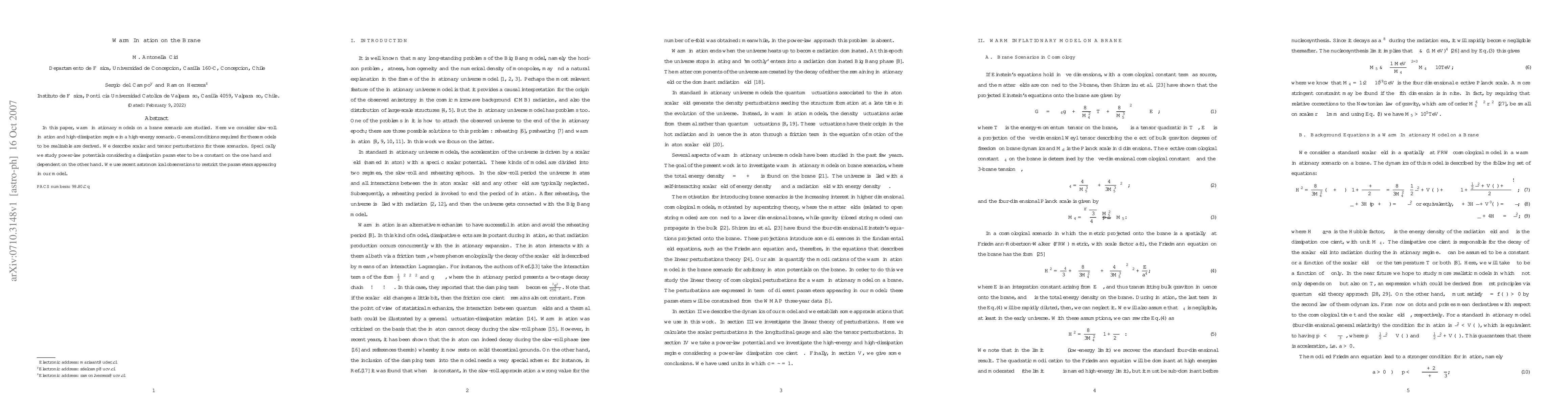 In this paper, warm inflationary models on a brane scenario are studied. Here we consider slow-roll inflation and high-dissipation regime in a high-energy scenario. General conditions required for these models to be realizable are derived. We describe scalar and tensor perturbations for these scenarios. Specifically we study power-law potentials considering a dissipation parameter to be a constant on the one hand and $\phi$ dependent on the other hand. We use recent astronomical observations to restrict the parameters appearing in our model.