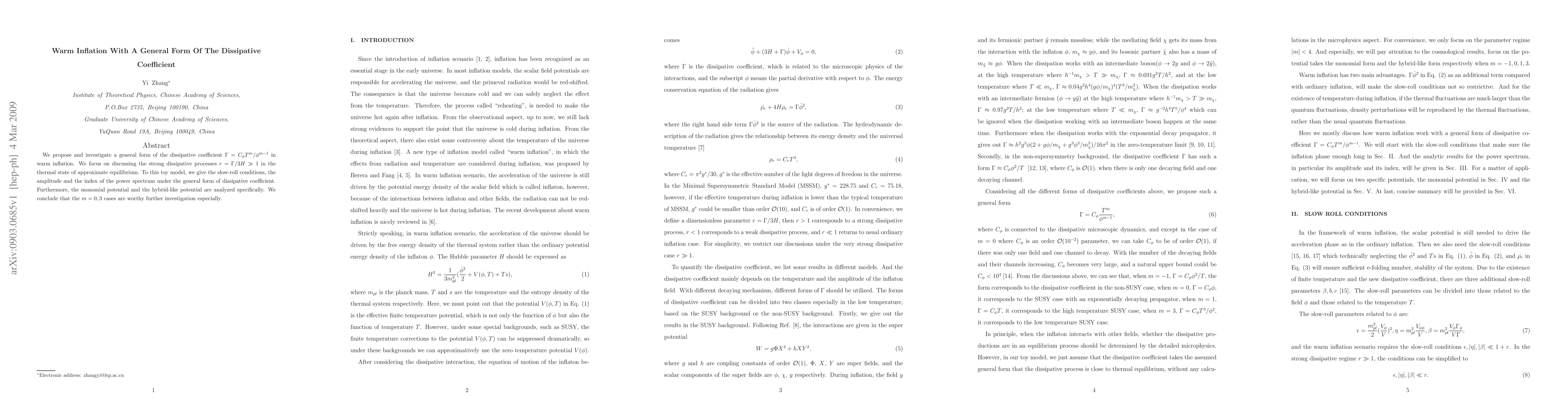 This paper explores a general form of the dissipative coefficient $\Gamma=C_{\phi}T^{m}/\phi^{m-1}$ in warm inflation, focusing on strong dissipative processes. It derives slow-roll conditions and analyzes the power spectrum, specifically examining monomial and hybrid-like potentials, highlighting $m=0,3$ for further study.