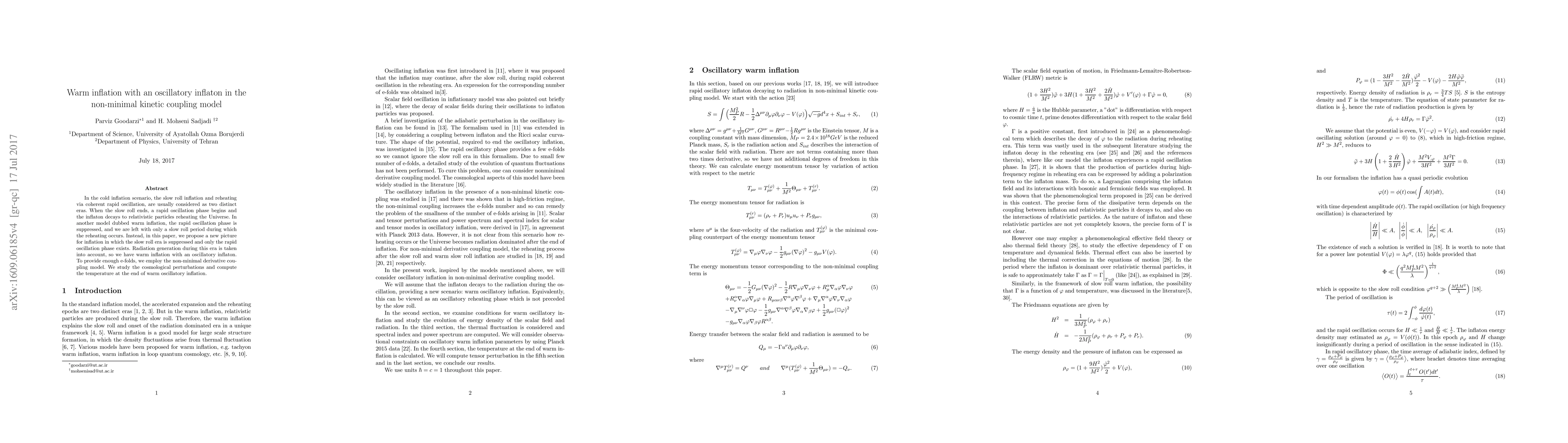 This paper proposes a model of warm inflation where the inflaton undergoes rapid oscillations instead of a slow roll, generating radiation and providing enough e-folds through a non-minimal kinetic coupling. It studies cosmological perturbations and calculates the temperature at the end of this oscillatory inflationary phase.
