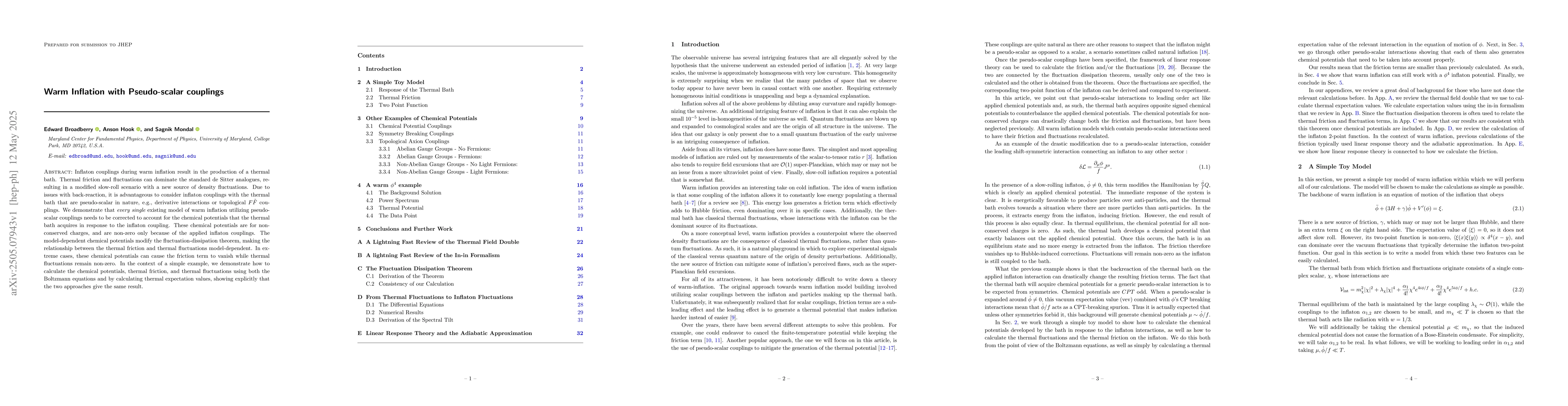 The paper presents a comprehensive analysis of warm inflation models with pseudo-scalar inflaton couplings, demonstrating the necessity to account for chemical potentials induced in the thermal bath and their impact on fluctuation-dissipation theorem.