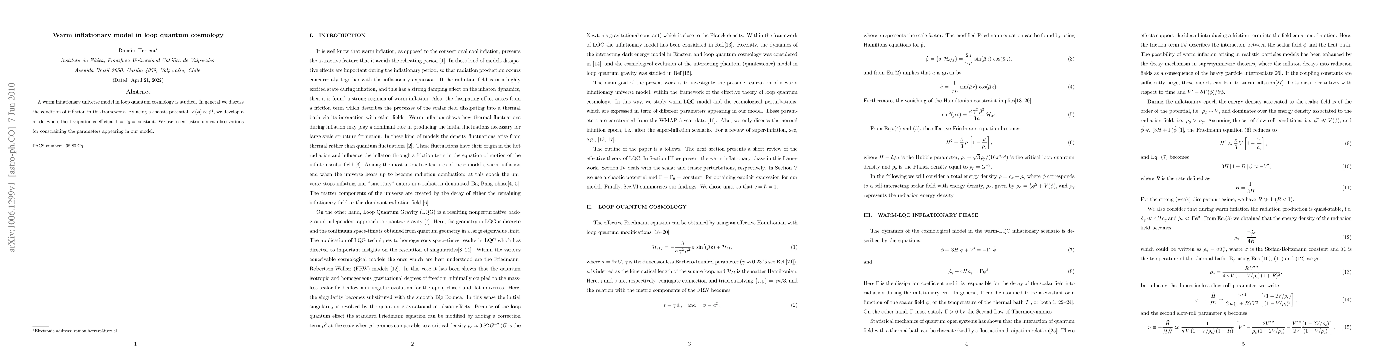This paper develops a warm inflationary model within loop quantum cosmology, using a chaotic potential $\phi^2$ and a constant dissipation coefficient $\Gamma_0$. It constrains model parameters using recent astronomical observations to meet inflationary conditions.