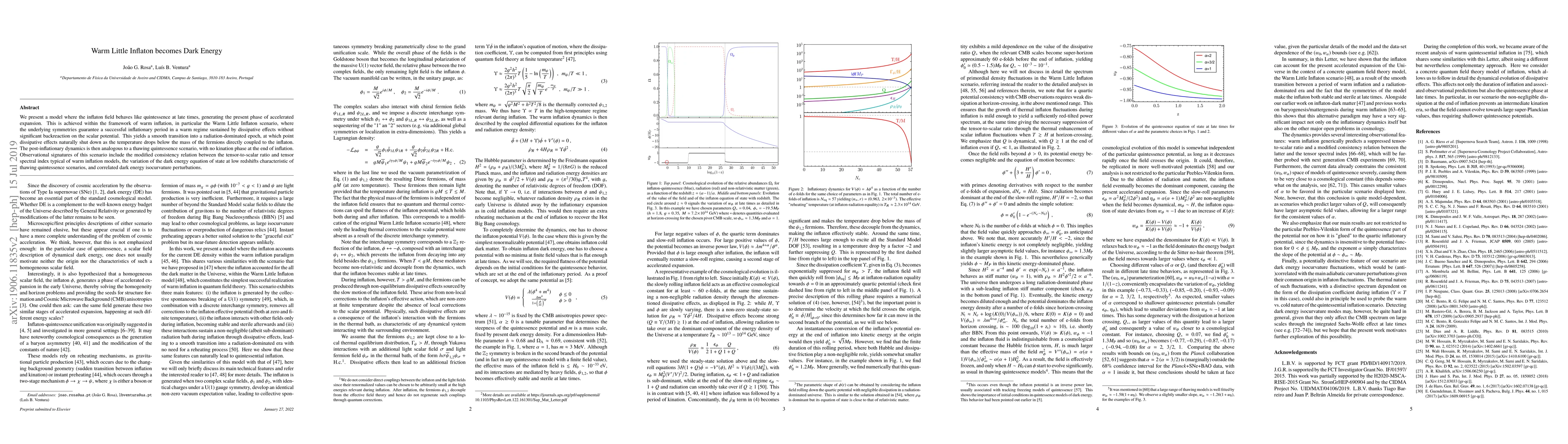 We present a model where the inflaton field behaves like quintessence at late times, generating the present phase of accelerated expansion. This is achieved within the framework of warm inflation, in particular the Warm Little Inflaton scenario, where the underlying symmetries guarantee a successful inflationary period in a warm regime sustained by dissipative effects without significant backreaction on the scalar potential. This yields a smooth transition into a radiation-dominated epoch, at which point dissipative effects naturally shut down as the temperature drops below the mass of the fermions directly coupled to the inflaton. The post-inflationary dynamics is then analogous to a thawing quintessence scenario, with no kination phase at the end of inflation. Observational signatures of this scenario include the modified consistency relation between the tensor-to-scalar ratio and tensor spectral index typical of warm inflation models, the variation of the dark energy equation of state at low redshifts characteristic of thawing quintessence scenarios, and correlated dark energy isocurvature perturbations.