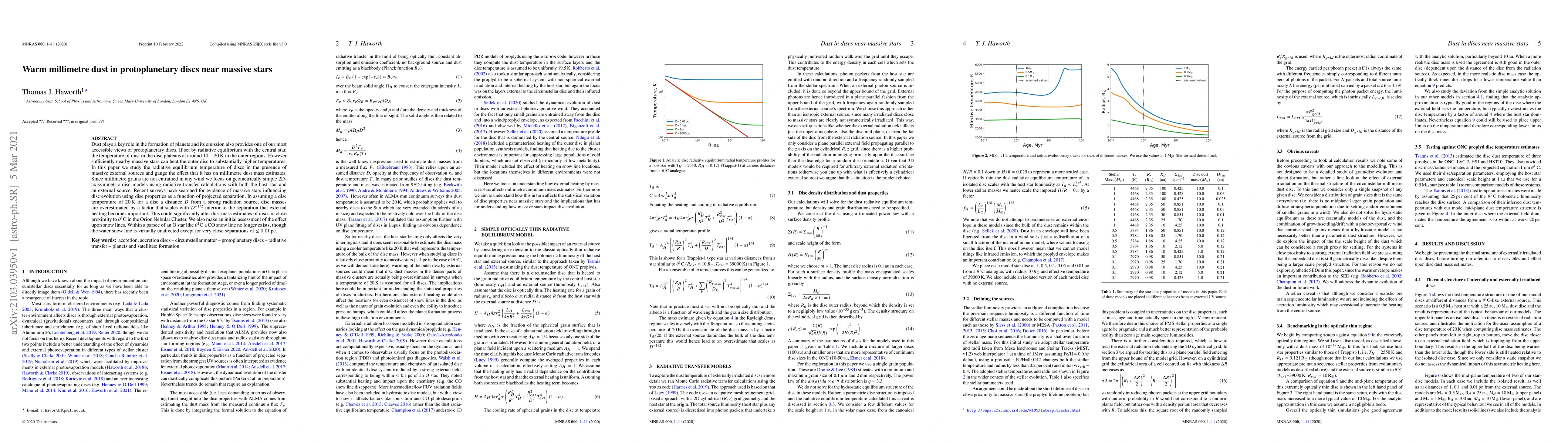 This paper investigates how the presence of massive stars influences the temperature of dust in protoplanetary discs, finding that external heating can significantly increase temperatures in the outer regions. It concludes that assuming a uniform $20$K temperature leads to overestimated disc masses, especially near strong radiation sources like $\theta^1$C in the Orion Nebular Cluster, and that within a parsec of an O star, CO snow lines are eliminated while water snow lines remain largely unaffected except for very close proximity.