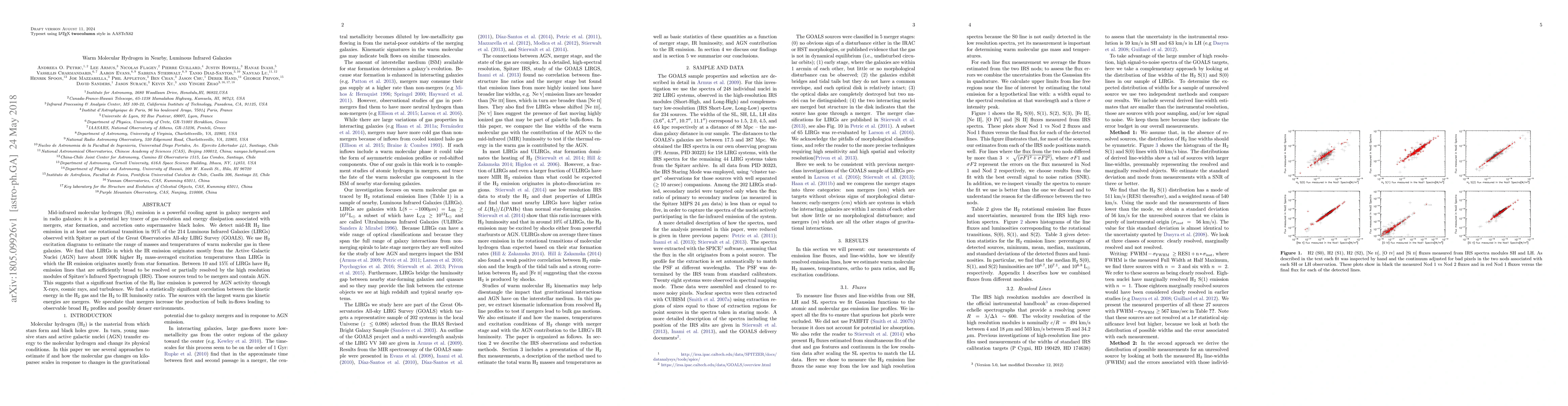 This study detects mid-infrared H$_2$ emission in 91% of Luminous Infrared Galaxies, revealing higher H$_2$ excitation temperatures in AGN-dominated galaxies compared to those driven by star formation. Mergers show broad H$_2$ lines, suggesting AGN activity as a significant source of H$_2$ emission.