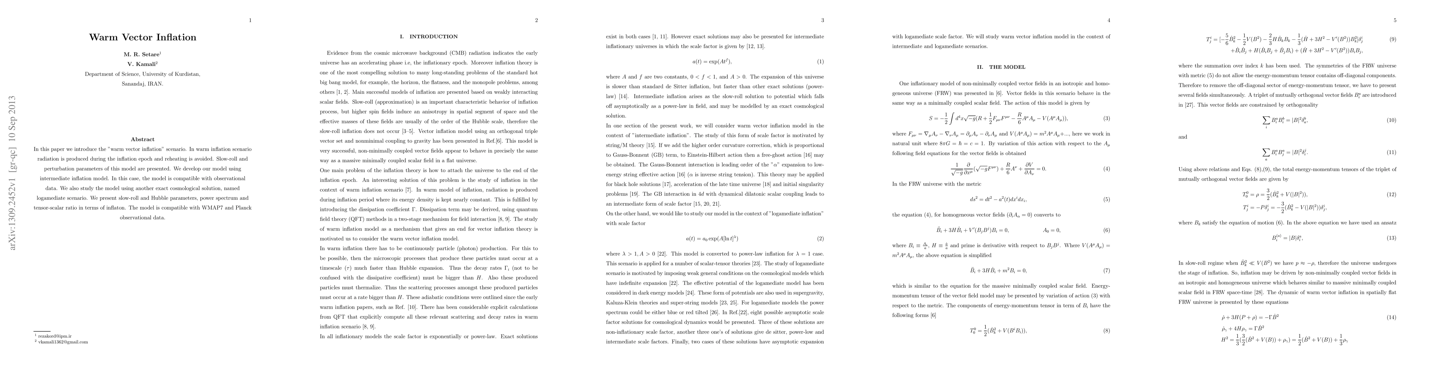 This paper introduces the "warm vector inflation" scenario, where radiation is generated during inflation without a reheating phase, utilizing intermediate and logamediate models. The model aligns with observational data from WMAP7 and Planck, providing slow-roll parameters, power spectrum, and tensor-scalar ratio.