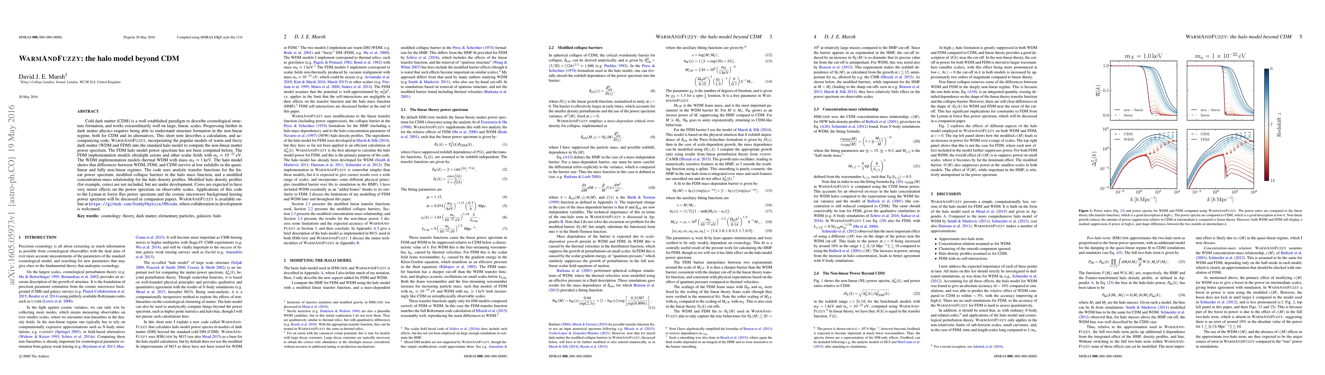 Cold dark matter (CDM) is a well established paradigm to describe cosmological structure formation, and works extraordinarily well on large, linear, scales. Progressing further in dark matter physics requires being able to understand structure formation in the non-linear regime, both for CDM and its alternatives. This short note describes a calculation, and accompanying code, WarmAndFuzzy, incorporating the popular models of warm and fuzzy dark matter (WDM and FDM) into the standard halo model to compute the non-linear matter power spectrum. The FDM halo model power spectrum has not been computed before. The FDM implementation models ultralight axions and other scalar fields with $m_a\approx 10^{-22}\text{ eV}$. The WDM implementation models thermal WDM with mass $m_X\approx 1\text{ keV}$. The halo model shows that differences between WDM, FDM, and CDM survive at low redshifts in the quasi-linear and fully non-linear regimes. The code uses analytic transfer functions for the linear power spectrum, modified collapse barriers in the halo mass function, and a modified concentration-mass relationship for the halo density profiles. Modified halo density profiles (for example, cores) are not included, but are under development. Cores are expected to have very minor effects on the power spectrum on observable scales. Applications of this code to the Lyman-$\alpha$ forest flux power spectrum and the cosmic microwave background lensing power spectrum will be discussed in companion papers. \textsc{WarmAndFuzzy} is available online at \url{https://github.com/DoddyPhysics/HMcode}, where collaboration in development is welcomed.