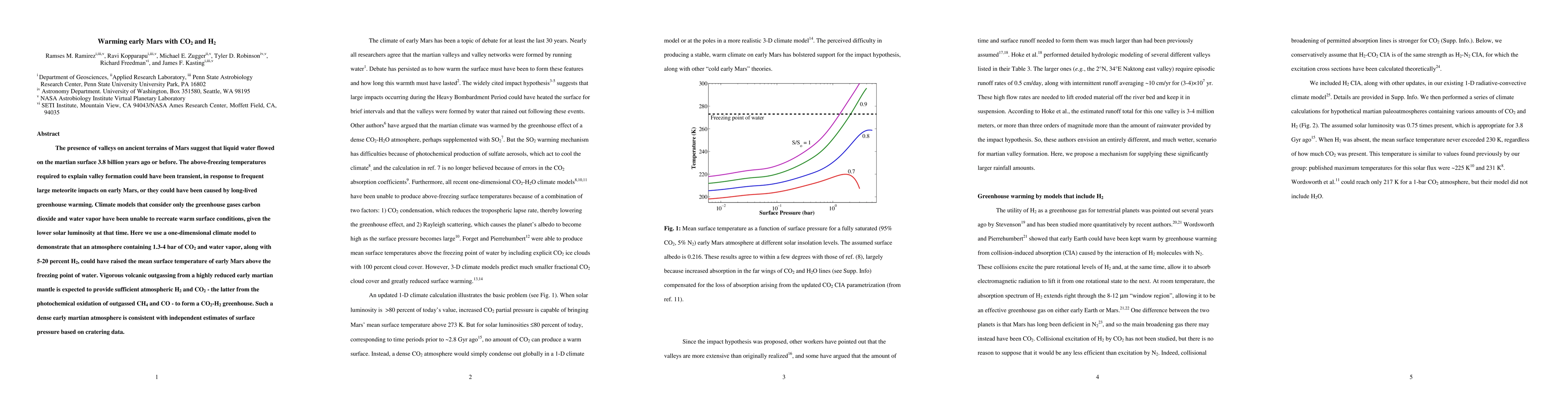 This paper proposes that a CO2-H2 greenhouse effect could have warmed early Mars, enabling liquid water flow, by modeling an atmosphere with 1.3-4 bar of CO2 and 5-20% H2, supported by volcanic outgassing. This dense atmosphere aligns with cratering data estimates.