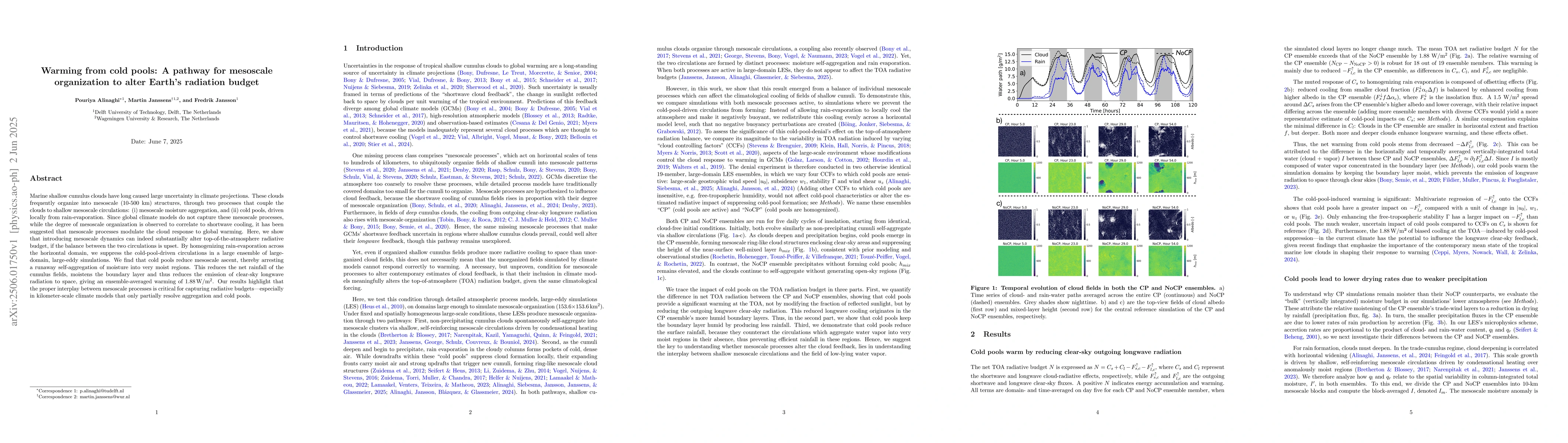 Mesoscale cloud organization affects Earth's radiation budget, with cold pools reducing rainfall and longwave radiation, leading to an ensemble-averaged warming of 1.88 W/m2.