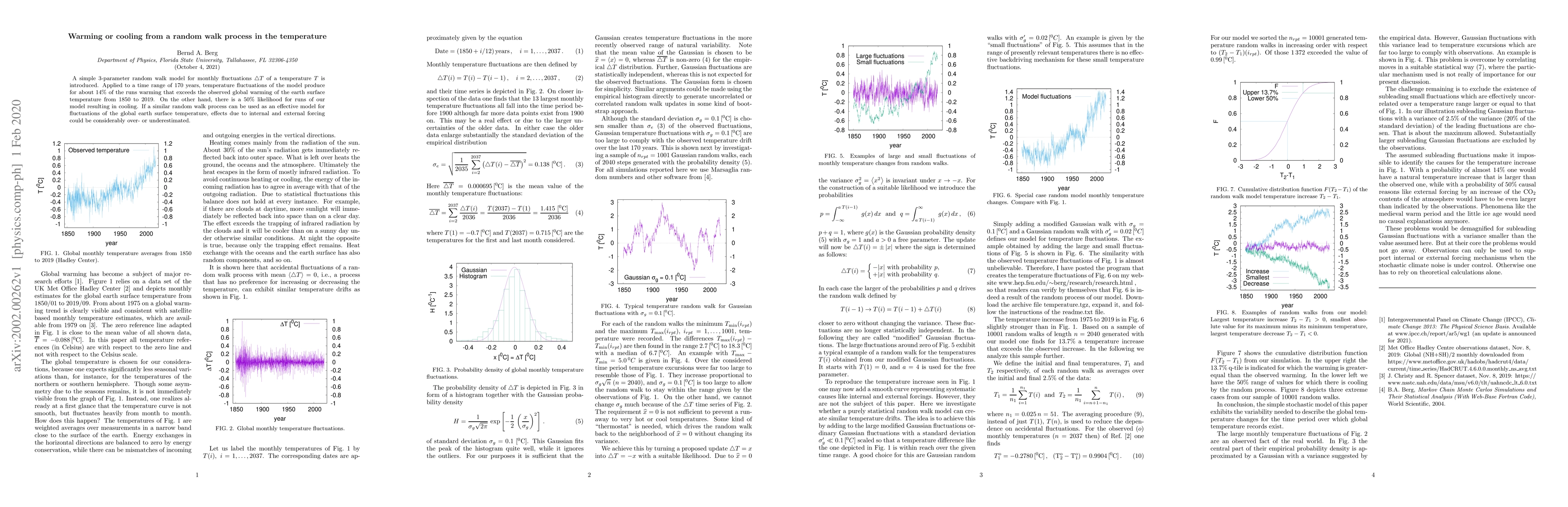 This paper introduces a 3-parameter random walk model to simulate monthly temperature fluctuations, finding that 14% of simulations show warming exceeding observed global warming, while 50% result in cooling, suggesting internal and external forcing effects may be over- or underestimated.