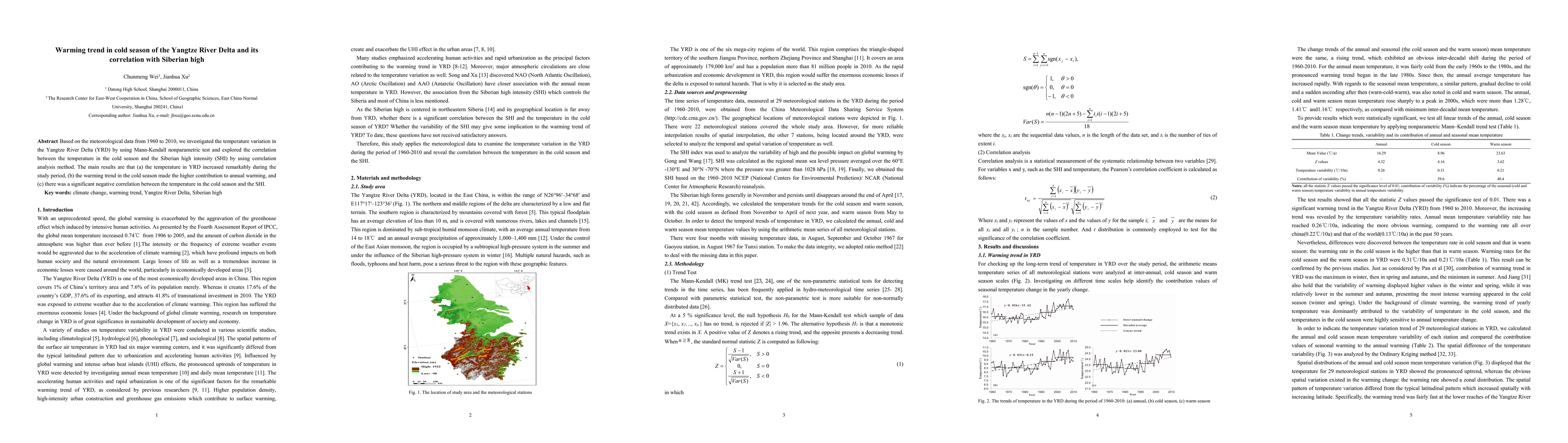The Yangtze River Delta experienced a remarkable warming trend from 1960 to 2010, with the cold season contributing most to annual warming. The study found a significant negative correlation between winter temperatures and Siberian high intensity.