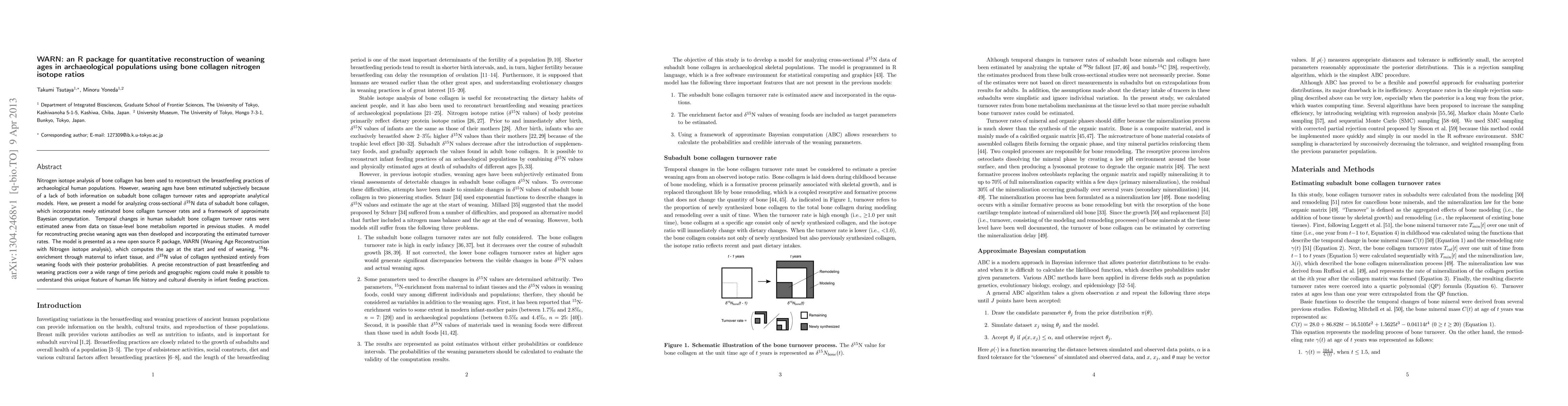 Nitrogen isotope analysis of bone collagen has been used to reconstruct the breastfeeding practices of archaeological human populations. However, weaning ages have been estimated subjectively because of a lack of both information on subadult bone collagen turnover rates and appropriate analytical models. Here, we present a model for analyzing cross-sectional delta-15N data of subadult bone collagen, which incorporates newly estimated bone collagen turnover rates and a framework of approximate Bayesian computation. Temporal changes in human subadult bone collagen turnover rates were estimated anew from data on tissue-level bone metabolism reported in previous studies. A model for reconstructing precise weaning ages was then developed and incorporating the estimated turnover rates. The model is presented as a new open source R package, WARN (Weaning Age Reconstruction with Nitrogen isotope analysis), which computes the age at the start and end of weaning, 15N-enrichment through maternal to infant tissue, and delta-15N value of collagen synthesized entirely from weaning foods with their posterior probabilities. A precise reconstruction of past breastfeeding and weaning practices over a wide range of time periods and geographic regions could make it possible to understand this unique feature of human life history and cultural diversity in infant feeding practices.