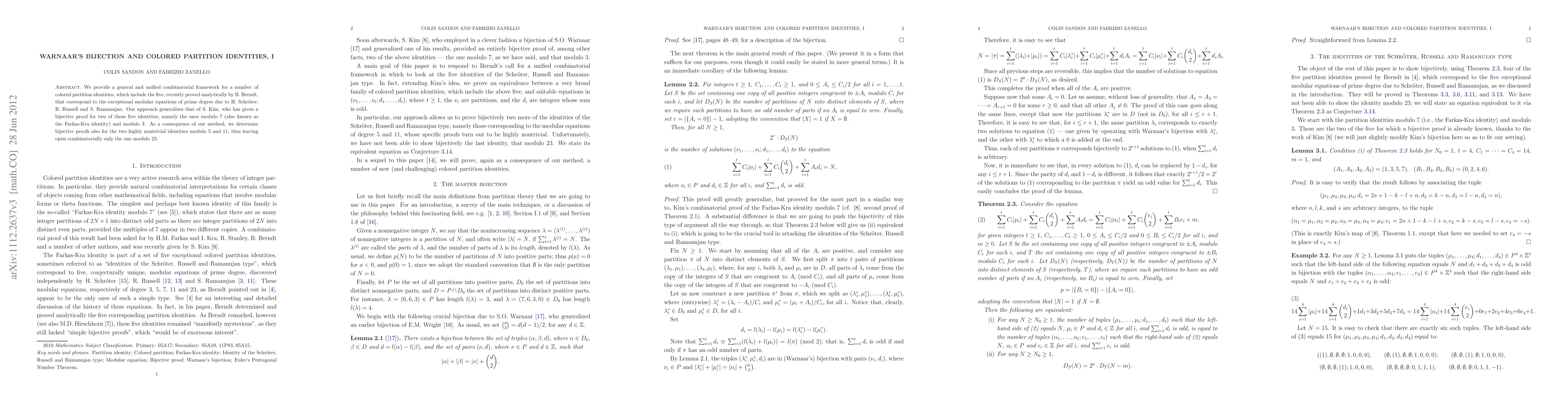 We provide a general and unified combinatorial framework for a number of colored partition identities, which include the five, recently proved analytically by B. Berndt, that correspond to the exceptional modular equations of prime degree due to H. Schroeter, R. Russell and S. Ramanujan. Our approach generalizes that of S. Kim, who has given a bijective proof for two of these five identities, namely the ones modulo 7 (also known as the Farkas-Kra identity) and modulo 3. As a consequence of our method, we determine bijective proofs also for the two highly nontrivial identities modulo 5 and 11, thus leaving open combinatorially only the one modulo 23.
