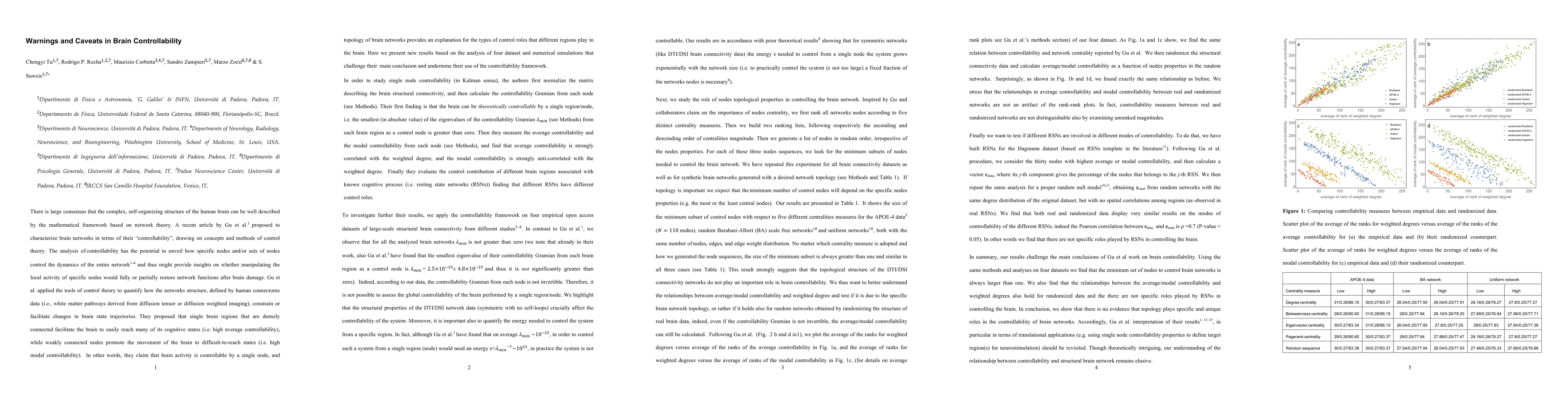 In this work we challenge the main conclusions of Gu et al work (Controllability of structural brain networks. Nature communications 6, 8414, doi:10.1038/ncomms9414, 2015) on brain controllability. Using the same methods and analyses on four datasets we find that the minimum set of nodes to control brain networks is always larger than one. We also find that the relationships between the average/modal controllability and weighted degrees also hold for randomized data and the there are not specific roles played by Resting State Networks in controlling the brain. In conclusion, we show that there is no evidence that topology plays specific and unique roles in the controllability of brain networks. Accordingly, Gu et al. interpretation of their results, in particular in terms of translational applications (e.g. using single node controllability properties to define target region(s) for neurostimulation) should be revisited. Though theoretically intriguing, our understanding of the relationship between controllability and structural brain network remains elusive.
