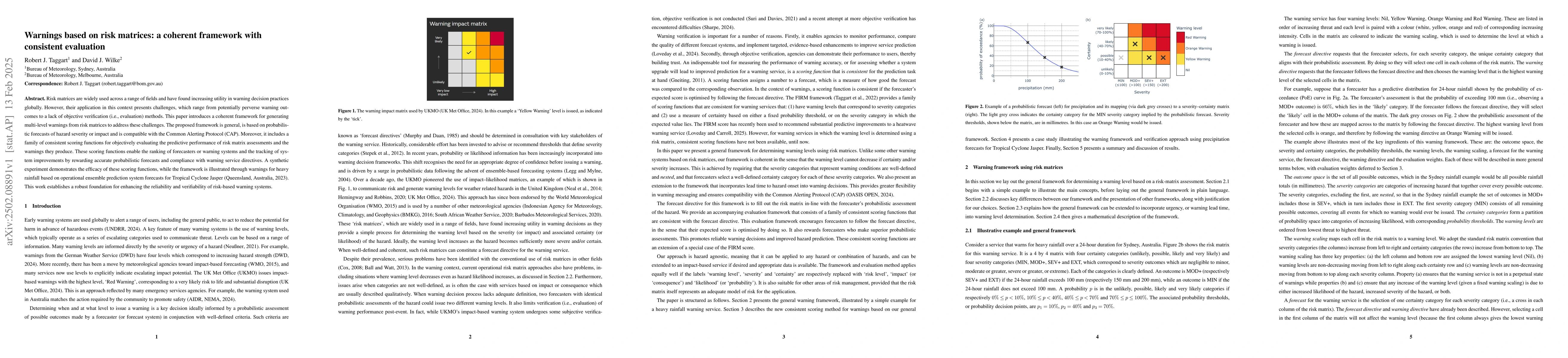 The research introduces a coherent framework for generating multi-level warnings from risk matrices, using probabilistic forecasts of hazard severity or impact. It includes a family of consistent scoring functions for objectively evaluating the predictive performance of risk matrix assessments and the warnings they produce.