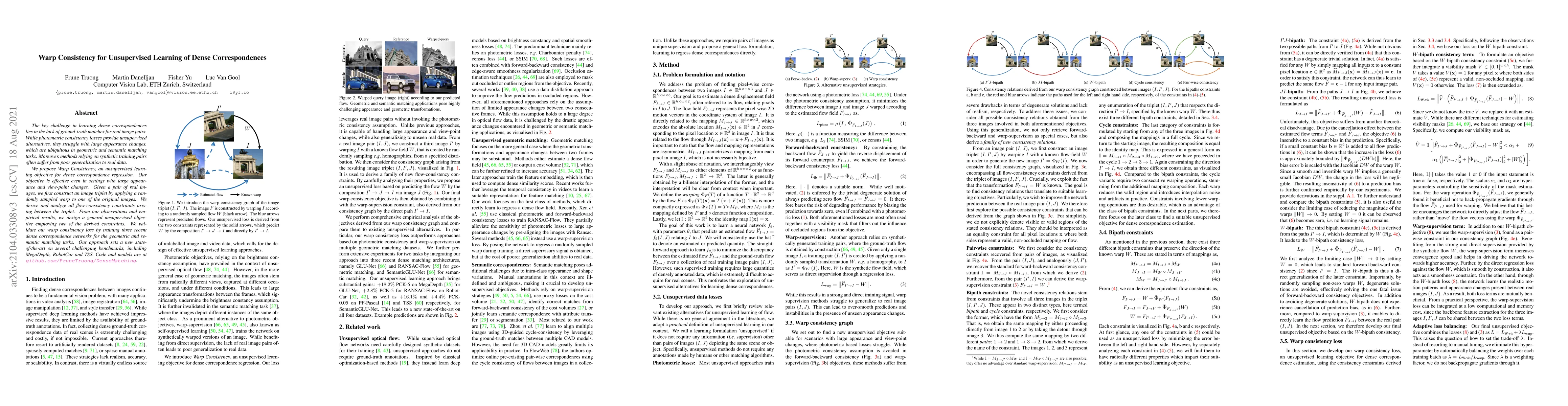 The paper proposes Warp Consistency, an unsupervised learning method for dense correspondence regression that effectively handles large appearance and viewpoint changes. It constructs image triplets using randomly sampled warps to derive flow-consistency constraints, setting a new state-of-the-art on several benchmarks.