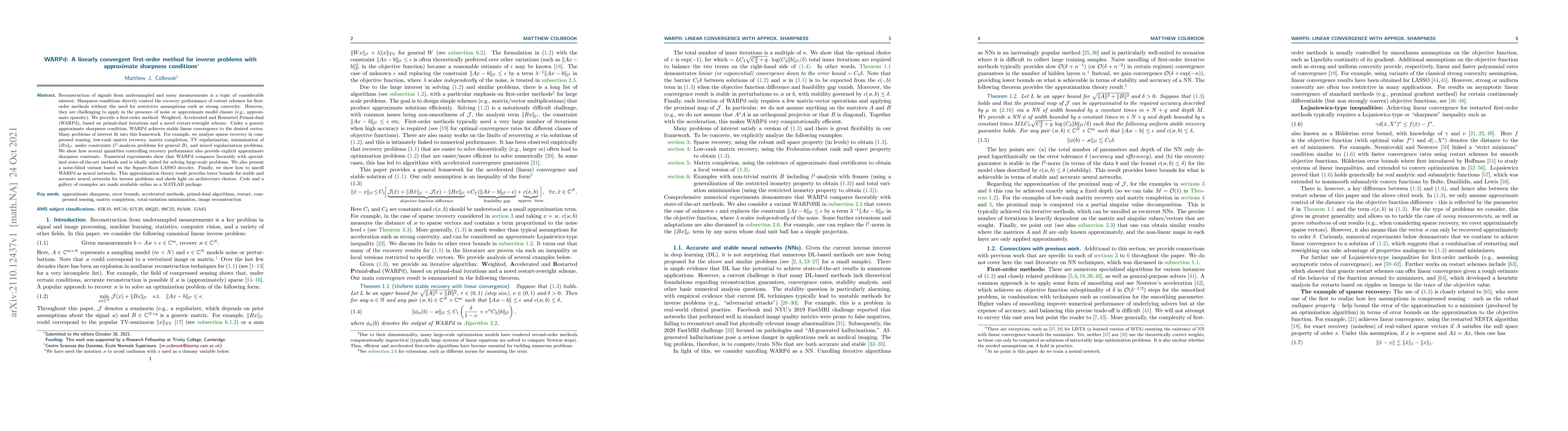 Reconstruction of signals from undersampled and noisy measurements is a topic of considerable interest. Sharpness conditions directly control the recovery performance of restart schemes for first-order methods without the need for restrictive assumptions such as strong convexity. However, they are challenging to apply in the presence of noise or approximate model classes (e.g., approximate sparsity). We provide a first-order method: Weighted, Accelerated and Restarted Primal-dual (WARPd), based on primal-dual iterations and a novel restart-reweight scheme. Under a generic approximate sharpness condition, WARPd achieves stable linear convergence to the desired vector. Many problems of interest fit into this framework. For example, we analyze sparse recovery in compressed sensing, low-rank matrix recovery, matrix completion, TV regularization, minimization of $\|Bx\|_{l^1}$ under constraints ($l^1$-analysis problems for general $B$), and mixed regularization problems. We show how several quantities controlling recovery performance also provide explicit approximate sharpness constants. Numerical experiments show that WARPd compares favorably with specialized state-of-the-art methods and is ideally suited for solving large-scale problems. We also present a noise-blind variant based on the Square-Root LASSO decoder. Finally, we show how to unroll WARPd as neural networks. This approximation theory result provides lower bounds for stable and accurate neural networks for inverse problems and sheds light on architecture choices. Code and a gallery of examples are made available online as a MATLAB package.