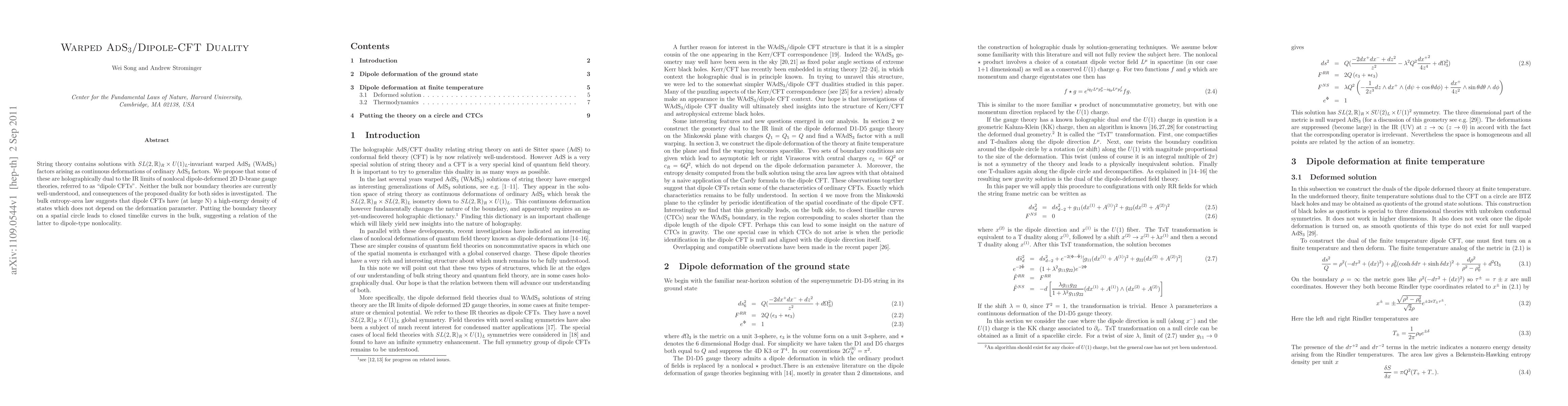 This paper proposes a holographic duality between warped AdS3 solutions in string theory and infrared limits of nonlocal dipole-deformed 2D gauge theories, termed dipole CFTs. The study explores implications of this duality, including the entropy-area law and the emergence of closed timelike curves.