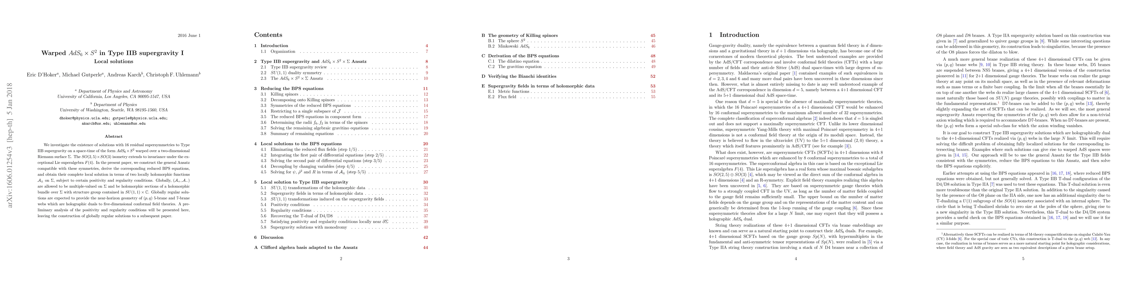 This paper constructs a local solution for Type IIB supergravity on $AdS_6 \times S^2$ with 16 supersymmetries, using an Ansatz compatible with $F(4)$ invariance. The solution involves two locally holomorphic functions ${\cal A}_\pm$ on $\Sigma$ under certain conditions, with a preliminary analysis of these conditions provided.