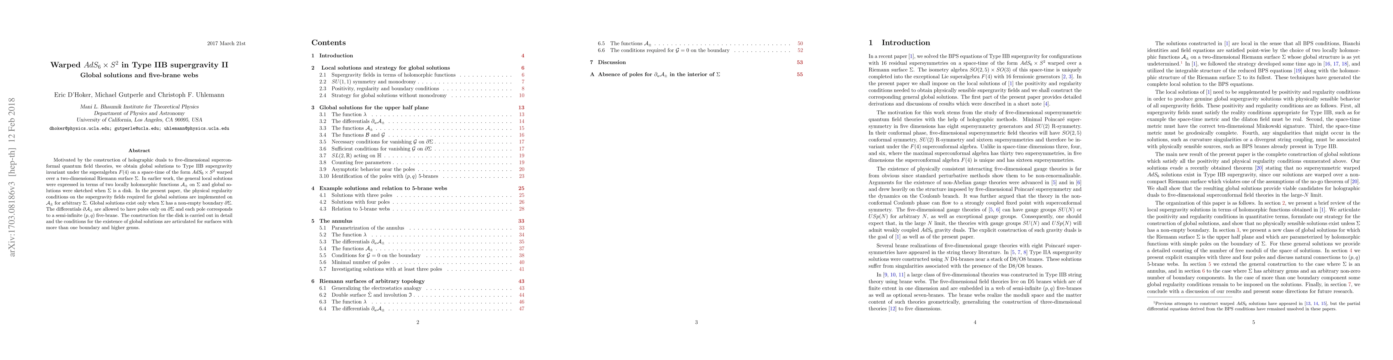 Motivated by the construction of holographic duals to five-dimensional superconformal quantum field theories, we obtain global solutions to Type IIB supergravity invariant under the superalgebra $F(4)$ on a space-time of the form $AdS_6 \times S^2$ warped over a two-dimensional Riemann surface $\Sigma$. In earlier work, the general local solutions were expressed in terms of two locally holomorphic functions $\mathcal A_\pm$ on $\Sigma$ and global solutions were sketched when $\Sigma$ is a disk. In the present paper, the physical regularity conditions on the supergravity fields required for global solutions are implemented on $\mathcal A_\pm$ for arbitrary $\Sigma$. Global solutions exist only when $\Sigma$ has a non-empty boundary $\partial \Sigma$. The differentials $\partial \mathcal A_\pm$ are allowed to have poles only on $\partial \Sigma$ and each pole corresponds to a semi-infinite $(p,q)$ five-brane. The construction for the disk is carried out in detail and the conditions for the existence of global solutions are articulated for surfaces with more than one boundary and higher genus.