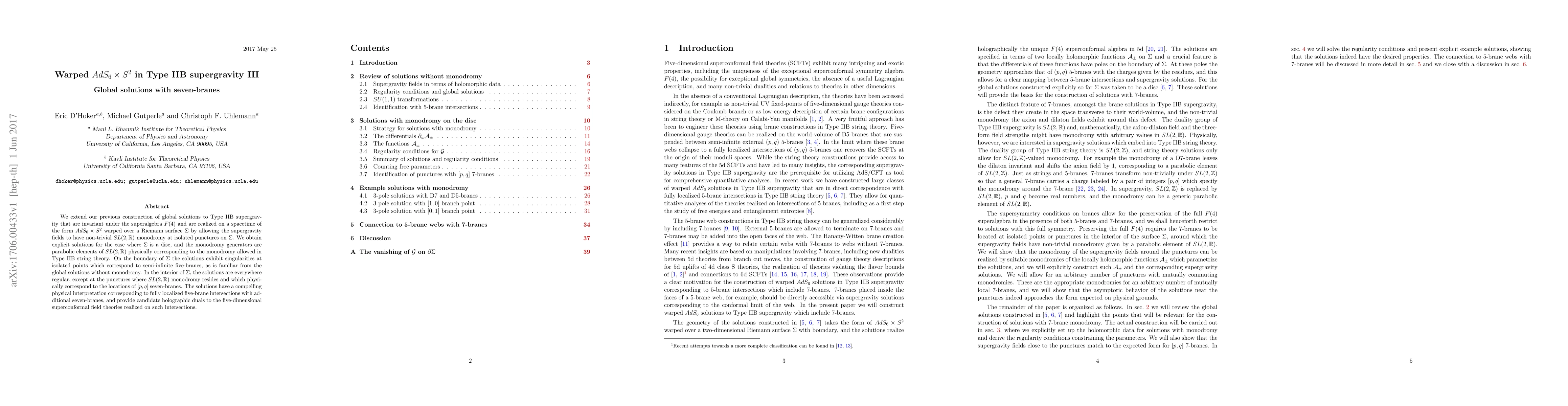 This paper extends previous work on global solutions in Type IIB supergravity, constructing new solutions on $AdS_6 \times S^2$ with $SL(2,\mathbb{R})$ monodromy at isolated punctures, corresponding to seven-branes. These solutions are regular inside the Riemann surface except at the punctures, where singularities represent intersections of five-branes and seven-branes.
