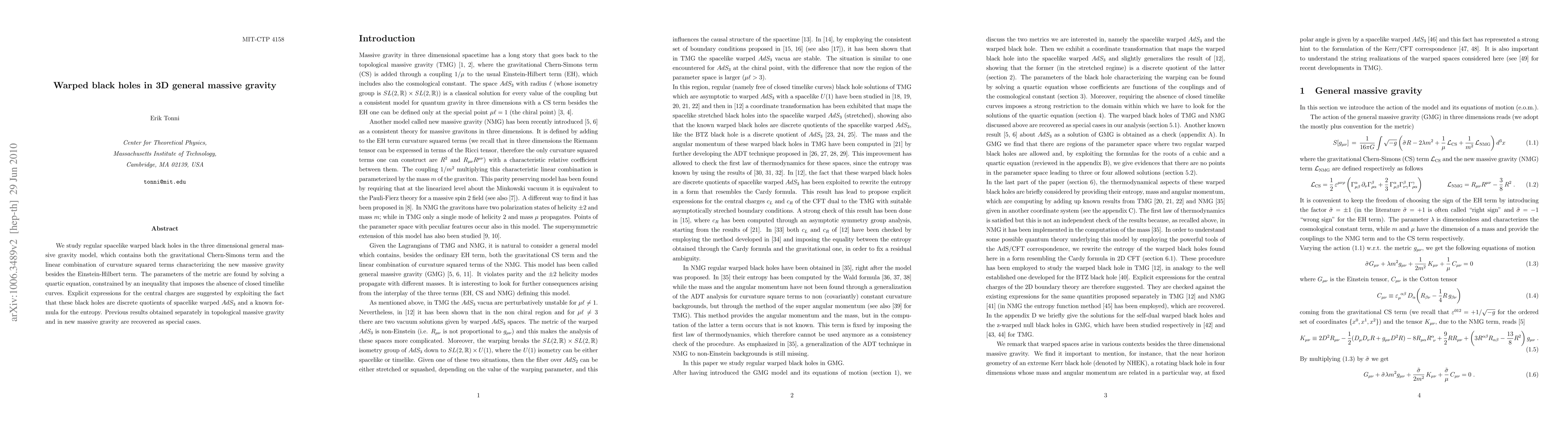 The paper presents a detailed mathematical framework for analyzing warped black holes in 3D general massive gravity, including the derivation of constraints on the metric parameters and the exploration of the parameter space for black hole solutions.