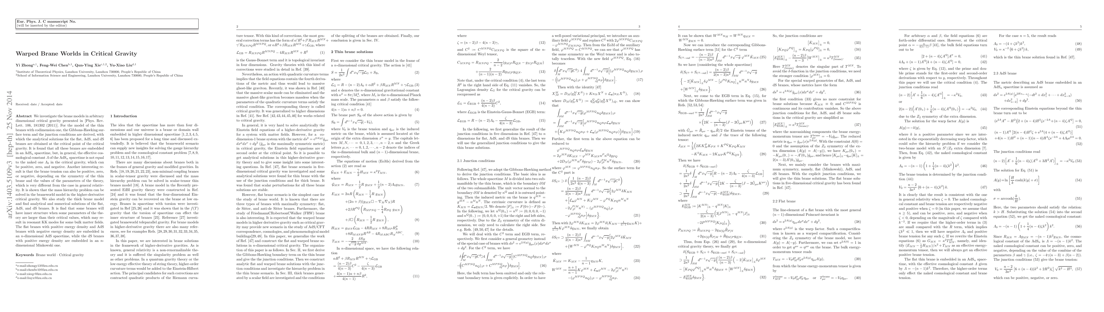The paper explores brane models in critical gravity, deriving Gibbons-Hawking surface terms and junction conditions for thin branes. It finds that these branes exist within AdS_n spacetimes, with varying effective cosmological constants and brane tensions. The study also examines thick brane models, revealing potential inner structures and resonant KK modes. The mass hierarchy problem can be addressed in this braneworld model, with flat branes in AdS and dS branes in Minkowski spacetimes.