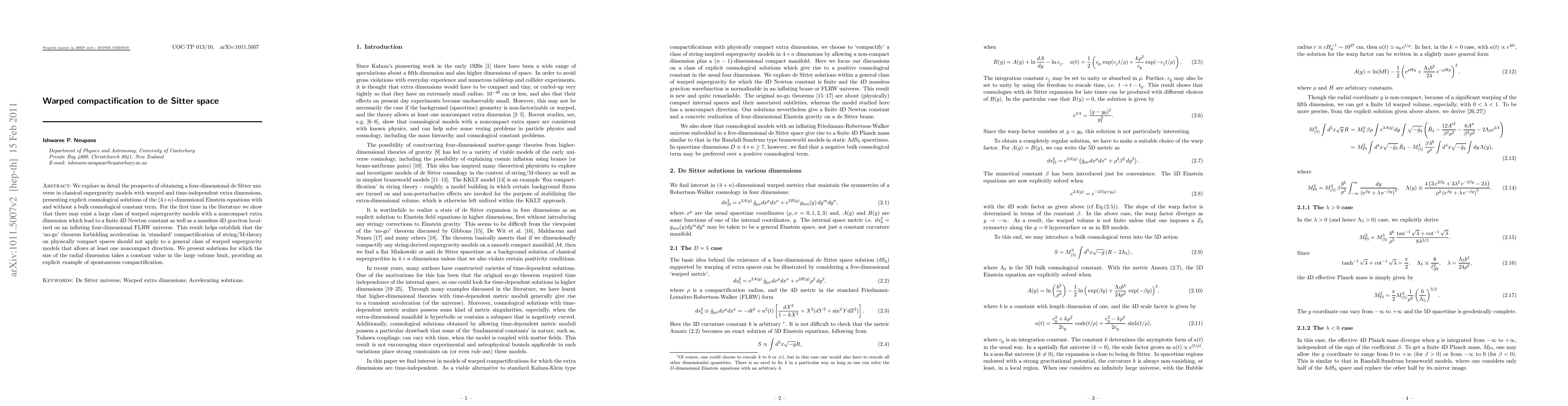 We explore in detail the prospects of obtaining a four-dimensional de Sitter universe in classical supergravity models with warped and time-independent extra dimensions, presenting explicit cosmological solutions of the $(4+n)$-dimensional Einstein equations with and without a bulk cosmological constant term. For the first time in the literature we show that there may exist a large class of warped supergravity models with a noncompact extra dimension which lead to a finite 4D Newton constant as well as a massless 4D graviton localised on an inflating four-dimensional FLRW universe. This result helps establish that the `no-go' theorem forbidding acceleration in `standard' compactification of string/M-theory on physically compact spaces should not apply to a general class of warped supergravity models that allows at least one noncompact direction. We present solutions for which the size of the radial dimension takes a constant value in the large volume limit, providing an explicit example of spontaneous compactification.