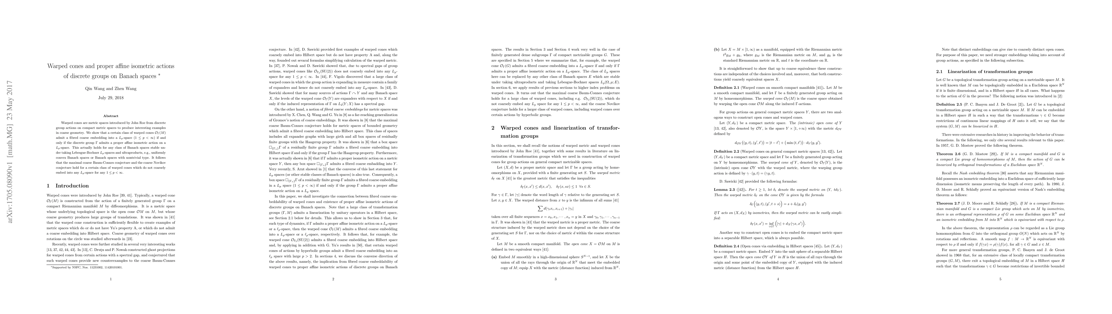 This paper explores warped cones, a type of metric space derived from discrete group actions, and proves their fibred coarse embedding into $L_p$-spaces if and only if the group has a proper affine isometric action on such spaces. It concludes that certain warped cones satisfy the maximal coarse Baum-Connes and Novikov conjectures despite not embedding into any $L_p$-space.