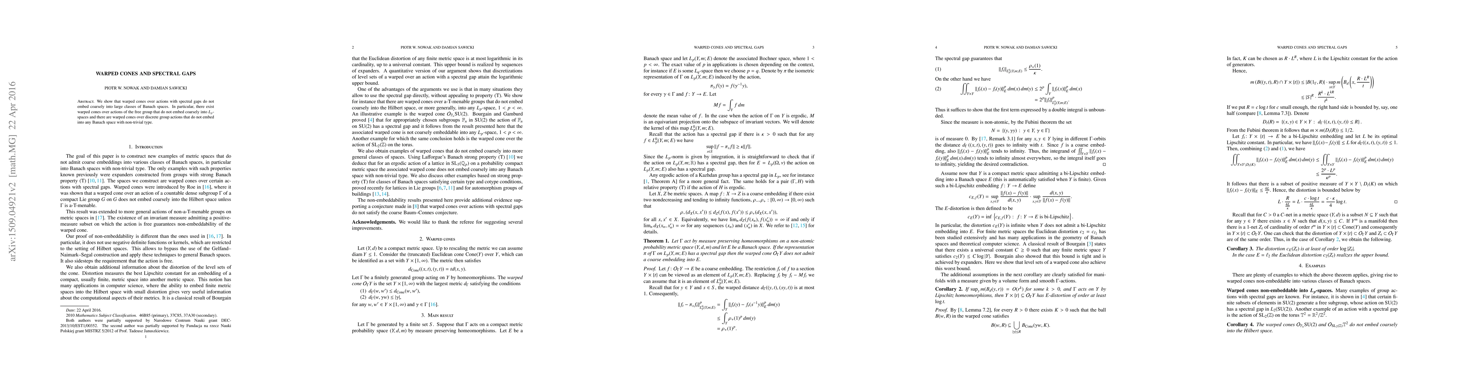 This paper demonstrates that warped cones derived from actions with spectral gaps cannot be coarsely embedded into large classes of Banach spaces, including $L_p$ spaces and spaces with non-trivial type. Specifically, it highlights that such cones from free group actions fail these embeddings.