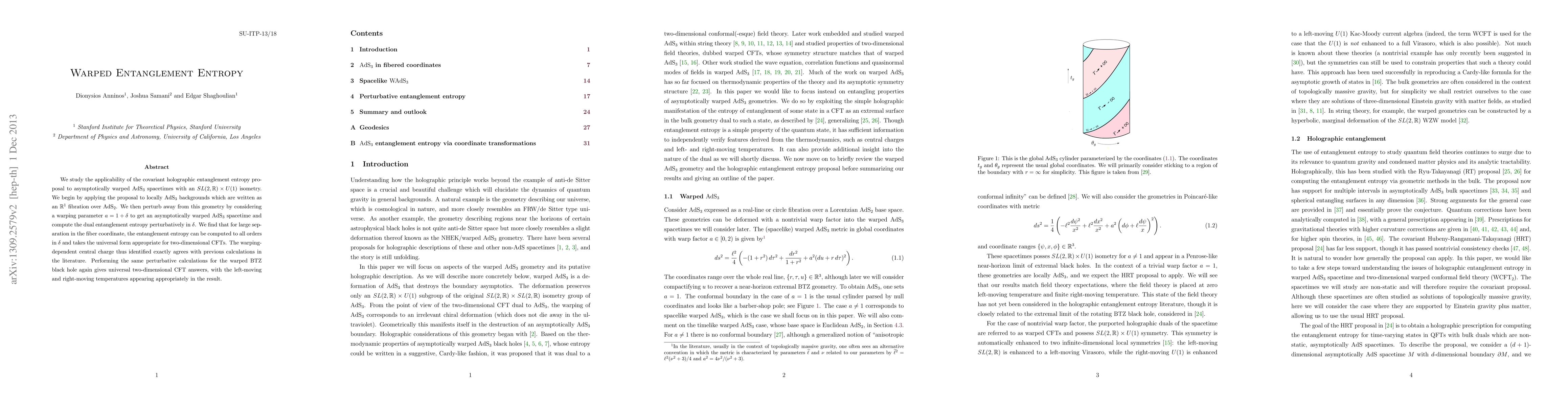This paper explores the covariant holographic entanglement entropy in asymptotically warped AdS$_3$ spacetimes with an SL(2,R) x U(1) isometry, finding that the entanglement entropy matches the universal form for two-dimensional CFTs even under perturbations. The calculated warping-dependent central charge aligns with previous results and applies similarly to warped BTZ black holes.
