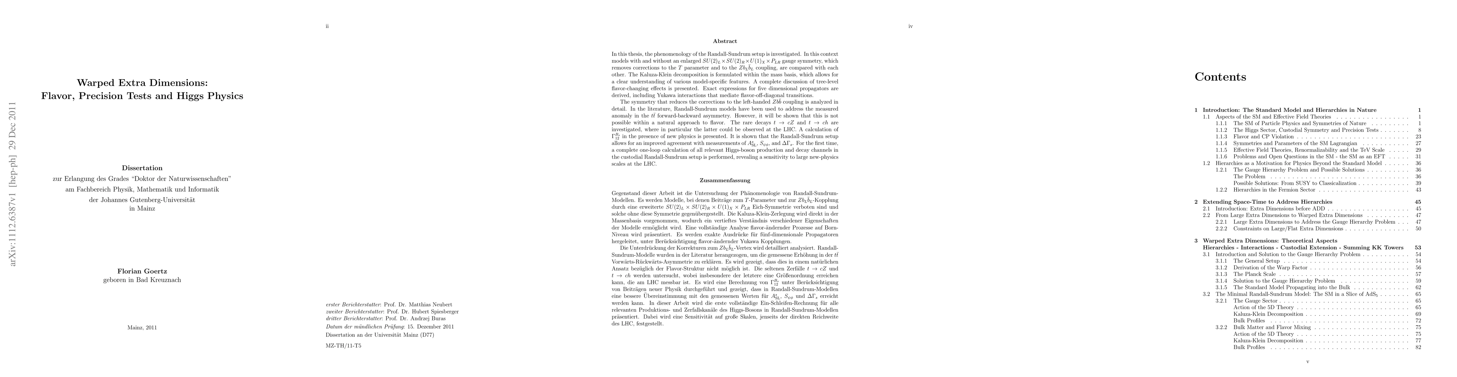 Researchers investigate the Randall-Sundrum model for warped extra dimensions, comparing models with different gauge symmetries and analyzing flavor-changing effects, rare decays, and Higgs boson production and decay channels.