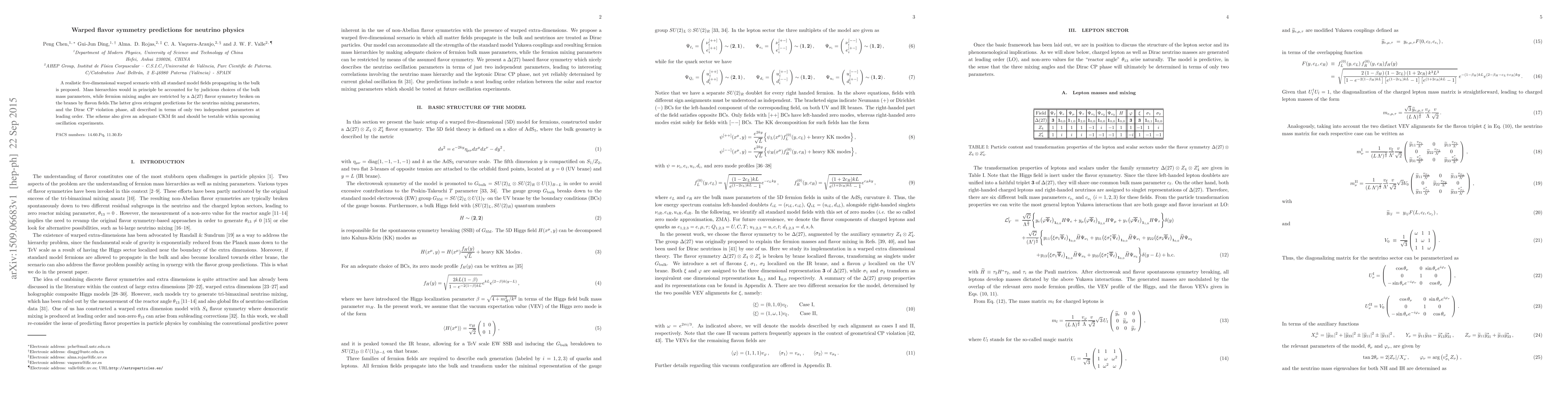 A realistic five-dimensional warped scenario with all standard model fields propagating in the bulk is proposed. Mass hierarchies would in principle be accounted for by judicious choices of the bulk mass parameters, while fermion mixing angles are restricted by a $\Delta(27)$ flavor symmetry broken on the branes by flavon fields. The latter gives stringent predictions for the neutrino mixing parameters, and the Dirac CP violation phase, all described in terms of only two independent parameters at leading order. The scheme also gives an adequate CKM fit and should be testable within upcoming oscillation experiments.