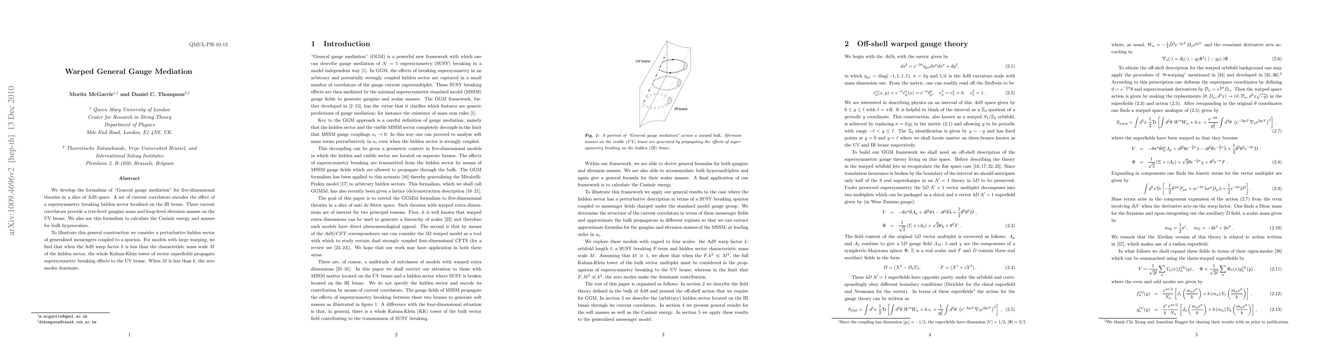 We develop the formalism of "General gauge mediation" for five dimensional theories in a slice of AdS space. A set of current correlators encodes the effect of a supersymmetry breaking hidden sector localised on the IR brane. These current correlators provide a tree-level gaugino mass and loop-level sfermion masses on the UV brane. We also use this formalism to calculate the Casimir energy and masses for bulk hyperscalars. To illustrate this general construction we consider a perturbative hidden sector of generalised messengers coupled to a spurion. For models with large warping, we find that when the AdS warp factor $k$ is less than the characteristc mass scale $M$ of the hidden sector, the whole Kaluza-Klein tower of vector superfields propagate supersymmetry breaking effects to the UV brane. When $M$ is less than $k$, the zero modes dominate.
