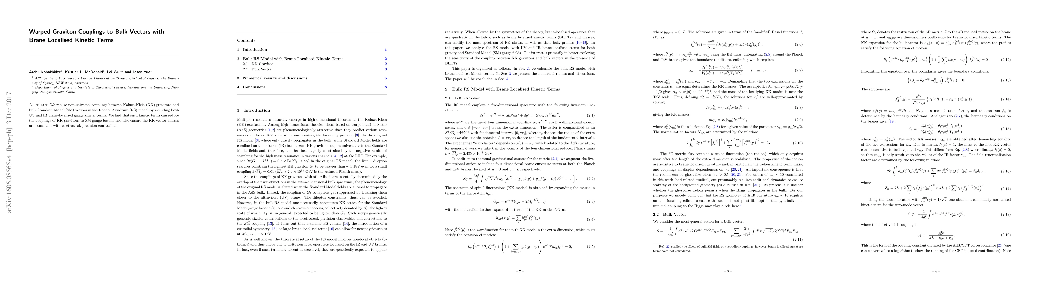 This paper explores non-universal couplings between Kaluza-Klein gravitons and bulk Standard Model vectors in the Randall-Sundrum model, achieved by incorporating UV and IR brane-localised gauge kinetic terms, which reduce KK graviton couplings to SM gauge bosons and maintain consistency with electroweak precision constraints.