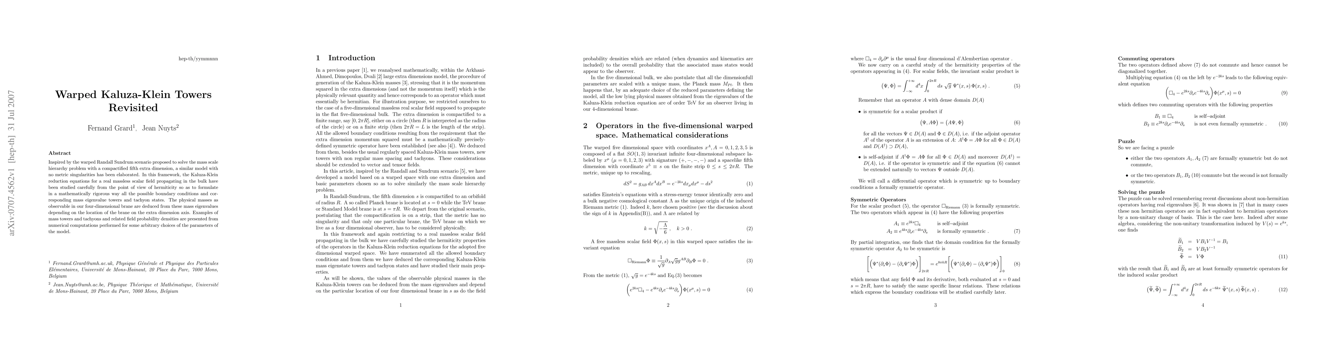 Inspired by the warped Randall Sundrum scenario proposed to solve the mass scale hierarchy problem with a compactified fifth extra dimension, a similar model with no metric singularities has been elaborated. In this framework, the Kaluza-Klein reduction equations for a real massless scalar field propagating in the bulk have been studied carefully from the point of view of hermiticity so as to formulate in a mathematically rigorous way all the possible boundary conditions and corresponding mass eigenvalue towers and tachyon states. The physical masses as observable in our four-dimensional brane are deduced from these mass eigenvalues depending on the location of the brane on the extra dimension axis. Examples of mass towers and tachyons and related field probability densities are presented from numerical computations performed for some arbitrary choices of the parameters of the model.