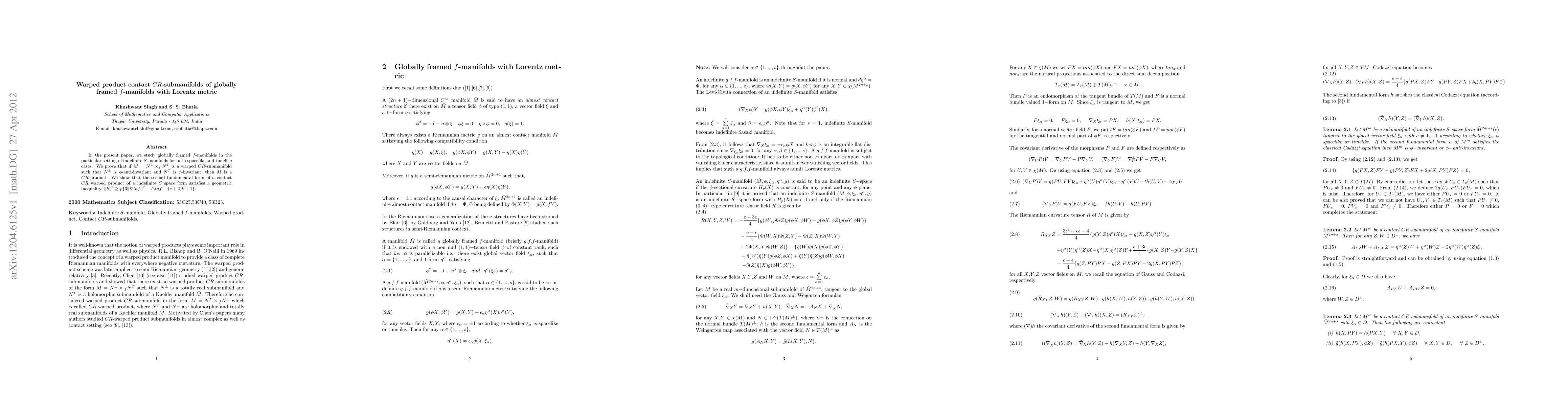 In the present paper, we study globally framed f-manifolds in the particular setting of indefinite S-manifolds for both spacelike and timelike cases. We prove that if $M = N^{\perp} \times_f N^T$ is a warped CR-submanifold such that $N^{\perp}$ is $\phi$?-anti-invariant and NT is $\phi$?-invariant, then M is a CR-product. We show that the second fundamental form of a contact CR warped product of a indefinite S space form satisfies a geometric inequality, $\|h\|^2 \geq p{3\|\nabla lnf\|^2 - \triangle lnf + (c + 2)k + 1}$.