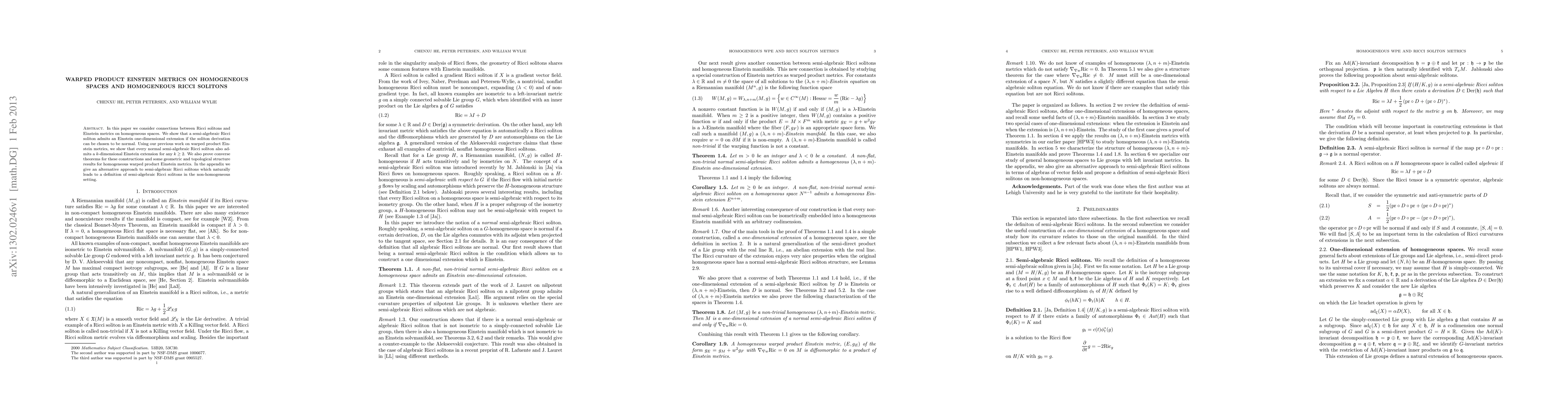 This paper explores the relationship between Ricci solitons and Einstein metrics on homogeneous spaces, demonstrating that normal semi-algebraic Ricci solitons can be extended to Einstein metrics in higher dimensions. It also proves converse theorems and provides structural results for homogeneous warped product Einstein metrics.