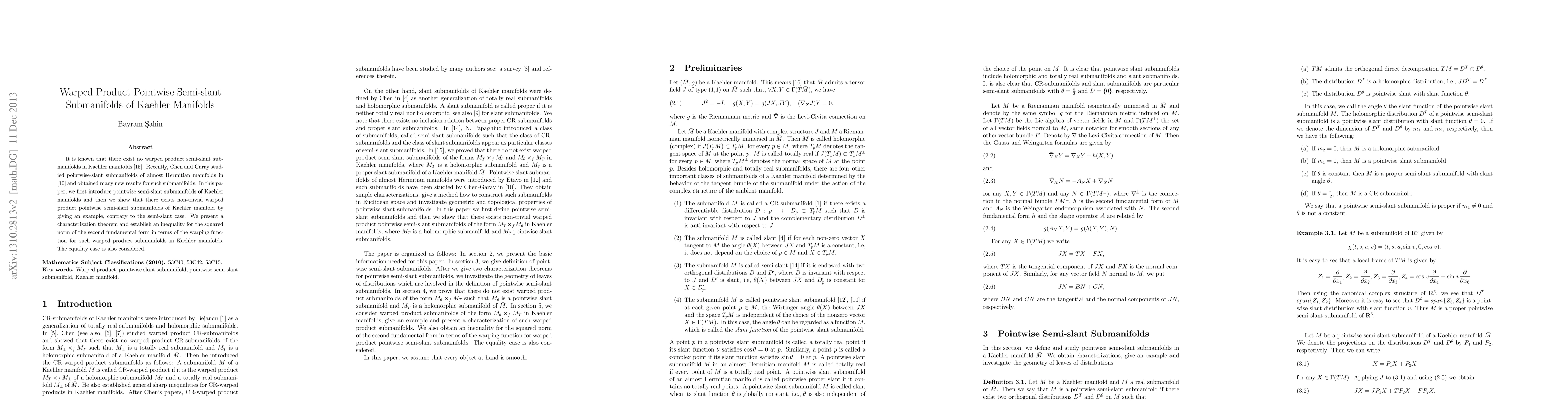 This paper introduces pointwise semi-slant submanifolds of Kaehler manifolds and demonstrates the existence of non-trivial warped product examples, unlike in the semi-slant case. It also provides a characterization theorem and an inequality for the squared norm of the second fundamental form, along with analysis of the equality case.