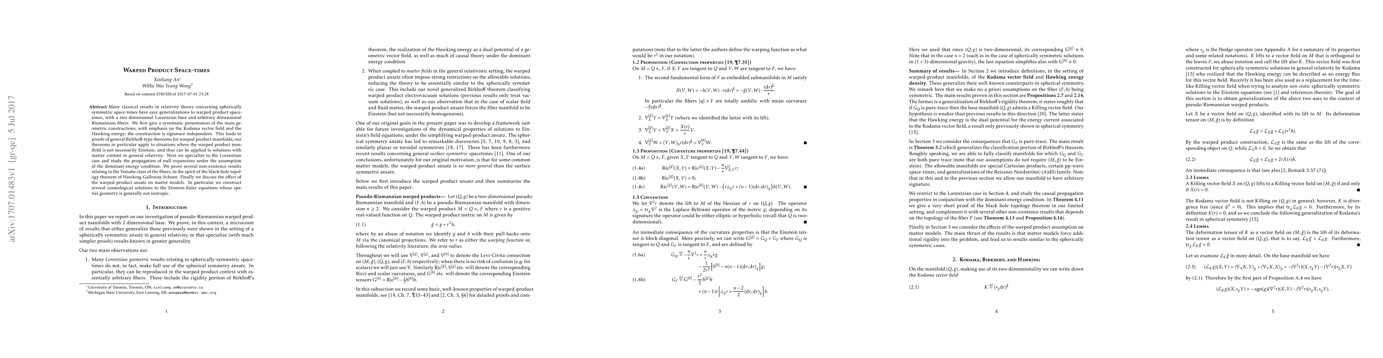 This paper generalizes classical relativity results to warped product space-times, presenting geometric constructions and proving Birkhoff-type theorems for these manifolds, even when they are not Einstein. It also explores the implications for matter models and constructs non-isotropic cosmological solutions.