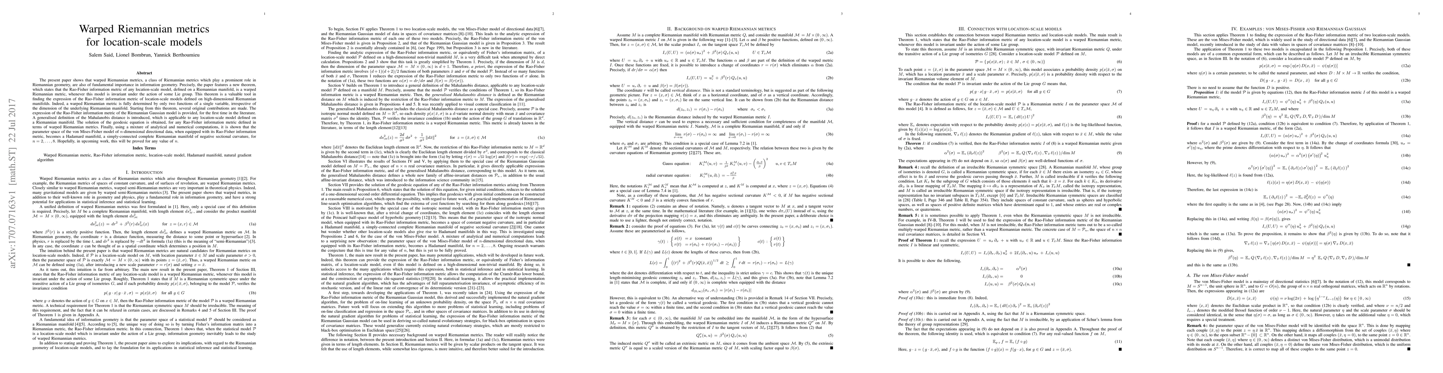 This paper demonstrates that the Rao-Fisher information metric for location-scale models, invariant under a Lie group action, is a warped Riemannian metric, simplifying its expression irrespective of manifold dimension. It introduces the expression for the Riemannian Gaussian model's Rao-Fisher metric, a generalized Mahalanobis distance, and proves the geodesic equation's solution for warped metrics, showing the von Mises-Fisher model's parameter space forms a Hadamard manifold for dimensions 2 to 8.